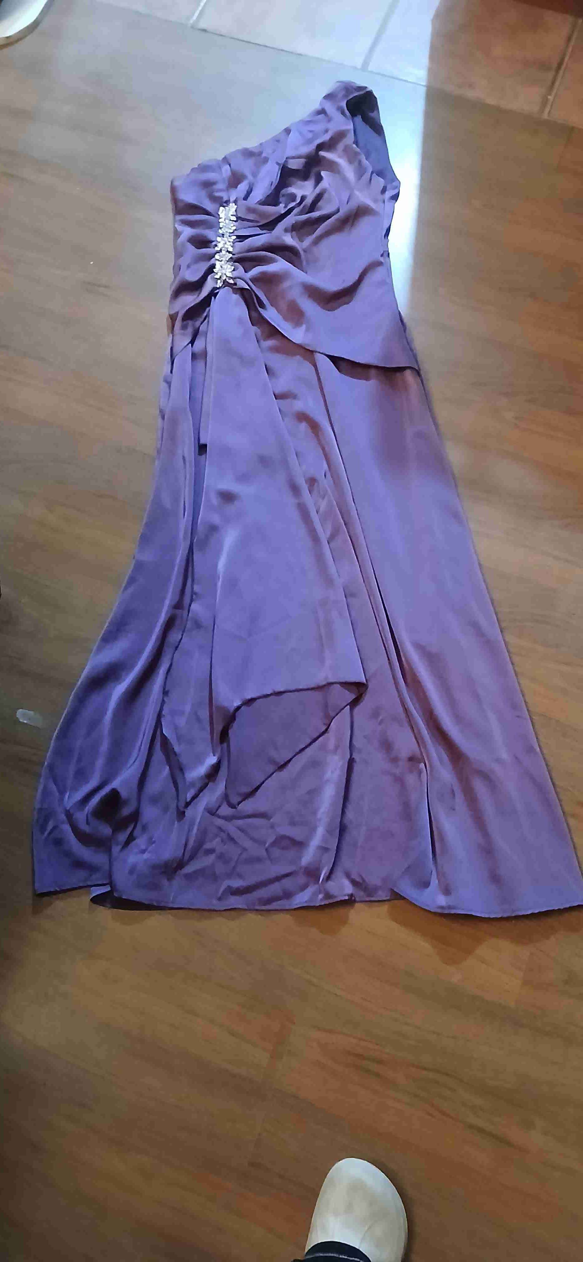 Vestido de fiesta morado con diseño de un solo hombro y detalle brillante. En buen estado, perfecto para eventos formales.