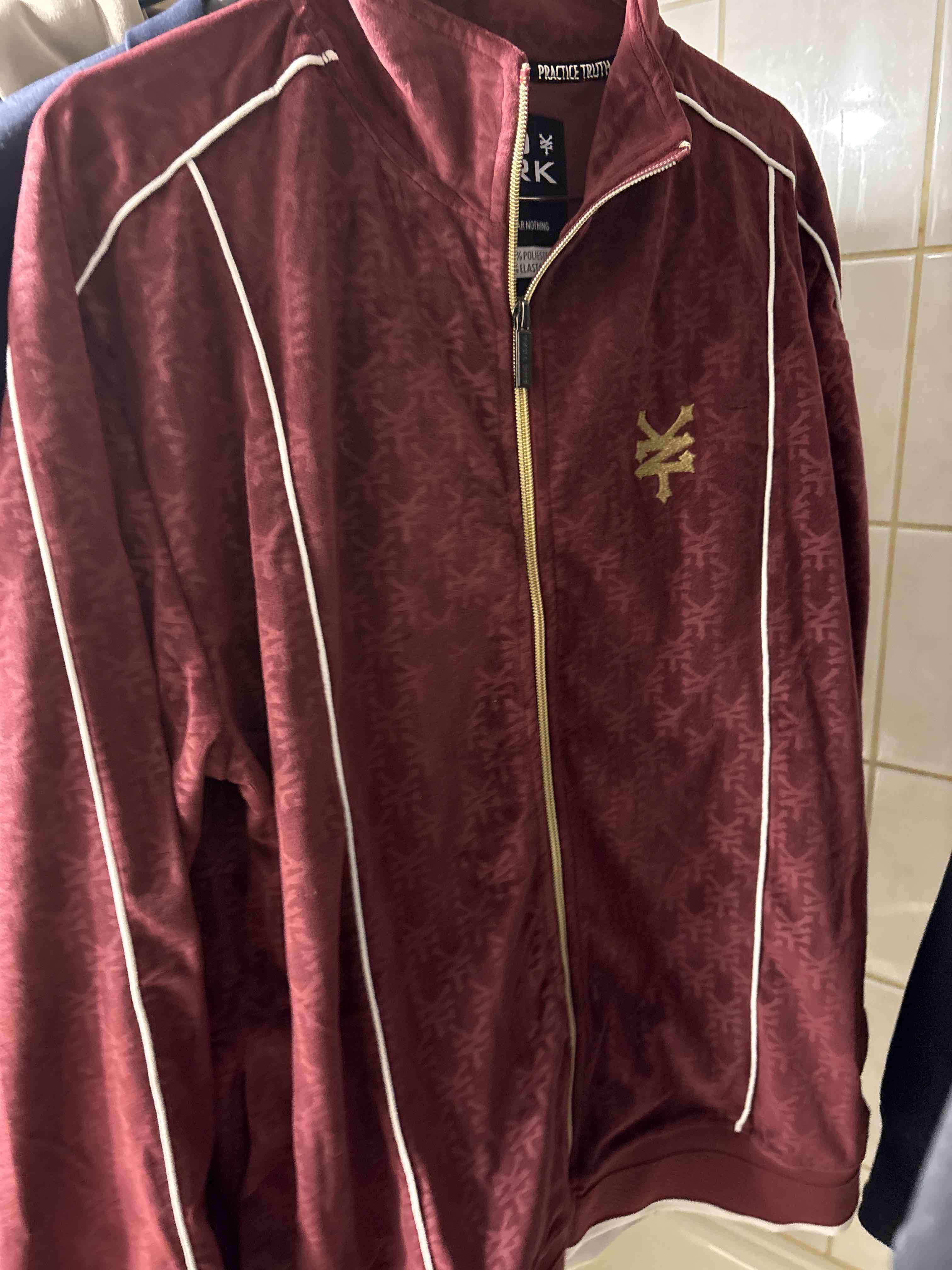 Chaqueta deportiva en color burdeos con cierre completo y detalles de franjas blancas. Ideal para uso casual o deportivo.