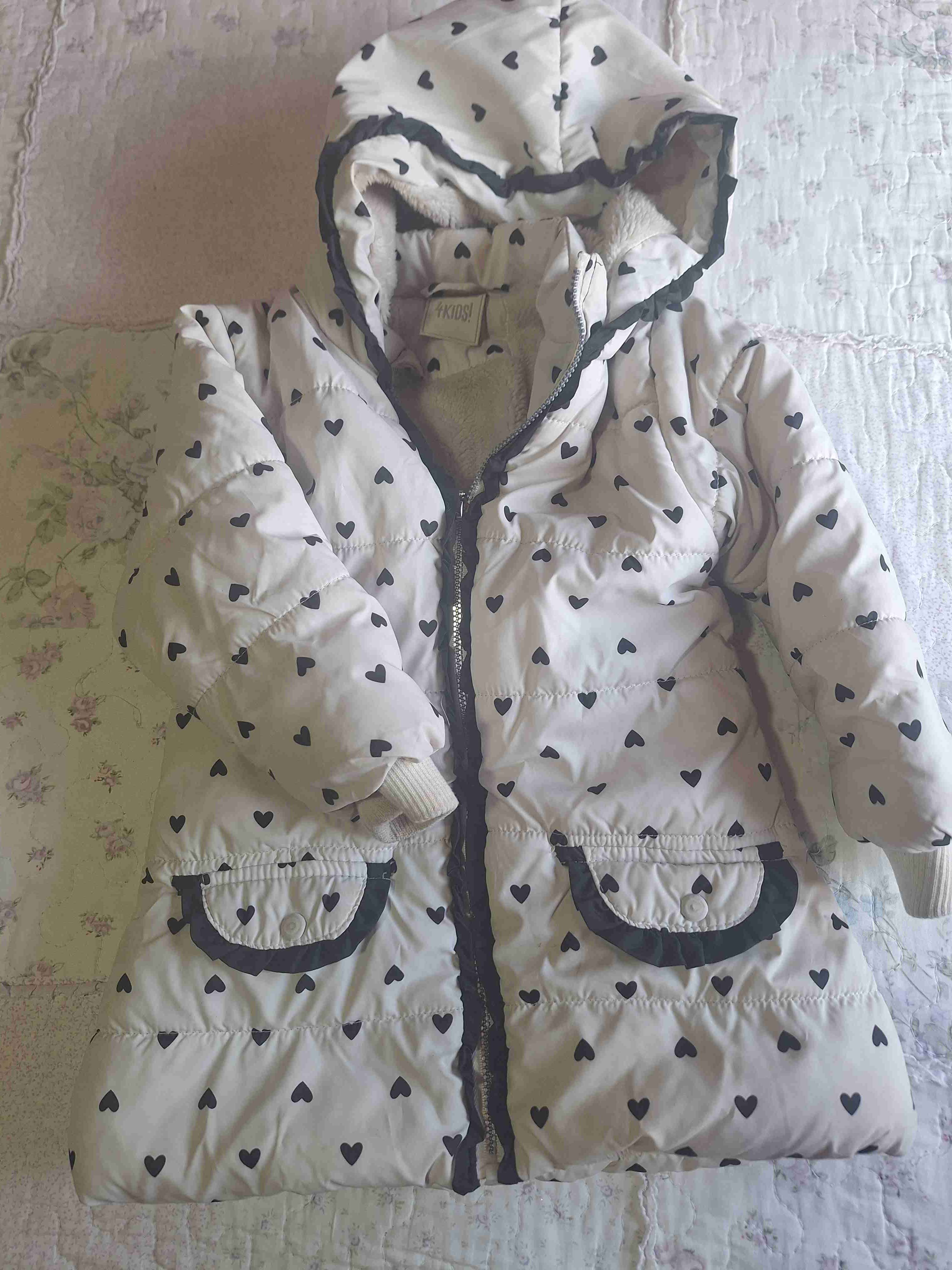 Linda chaqueta para niña con estampado de corazones, ideal para el frío. En buen estado general. Marca 4 Kids
