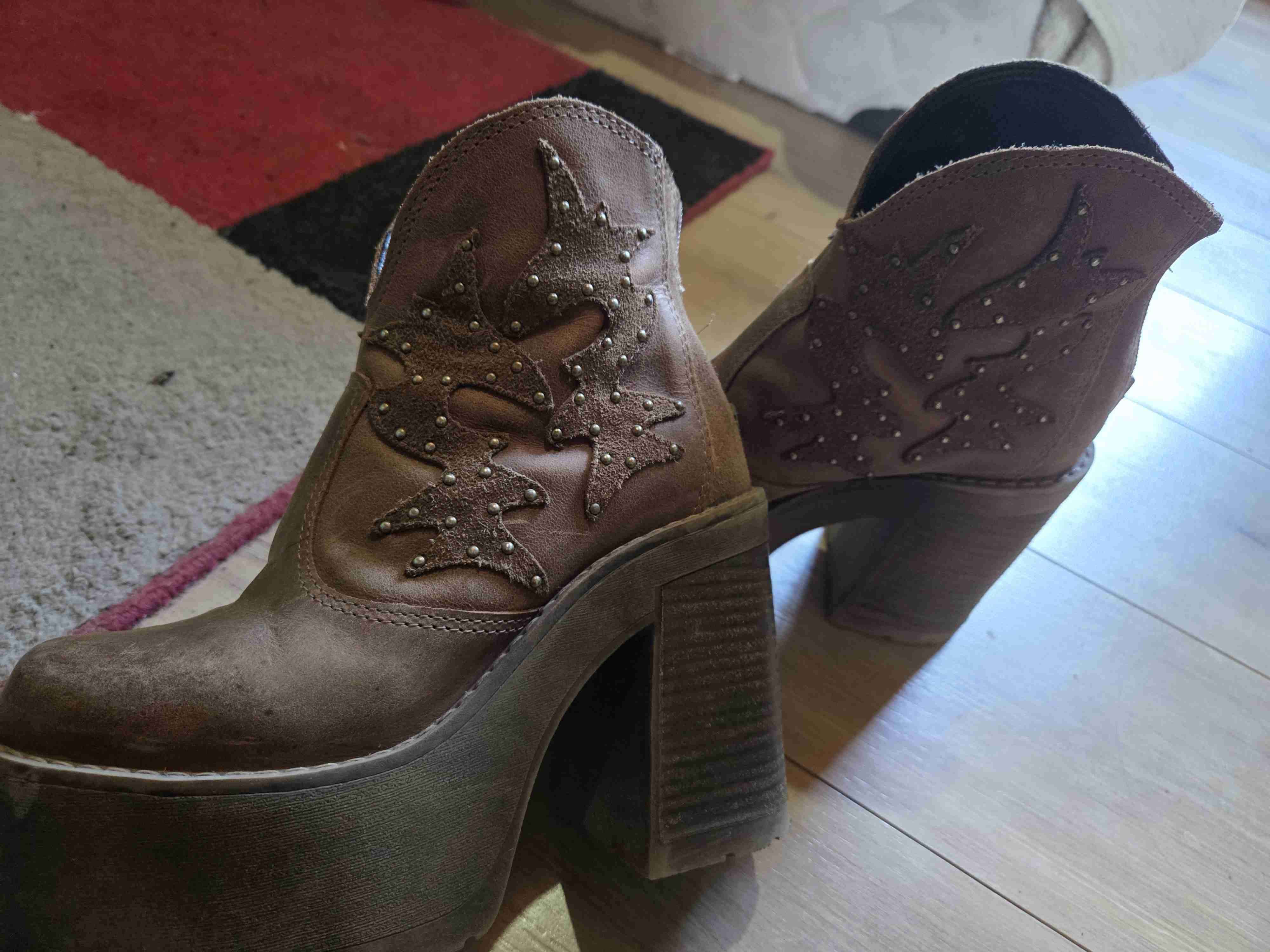 Botines de cuero marrón con adornos decorativos estilo vaquero. En buen estado, ideales para un look casual chic. Talla 35 no ahi para marcar 35