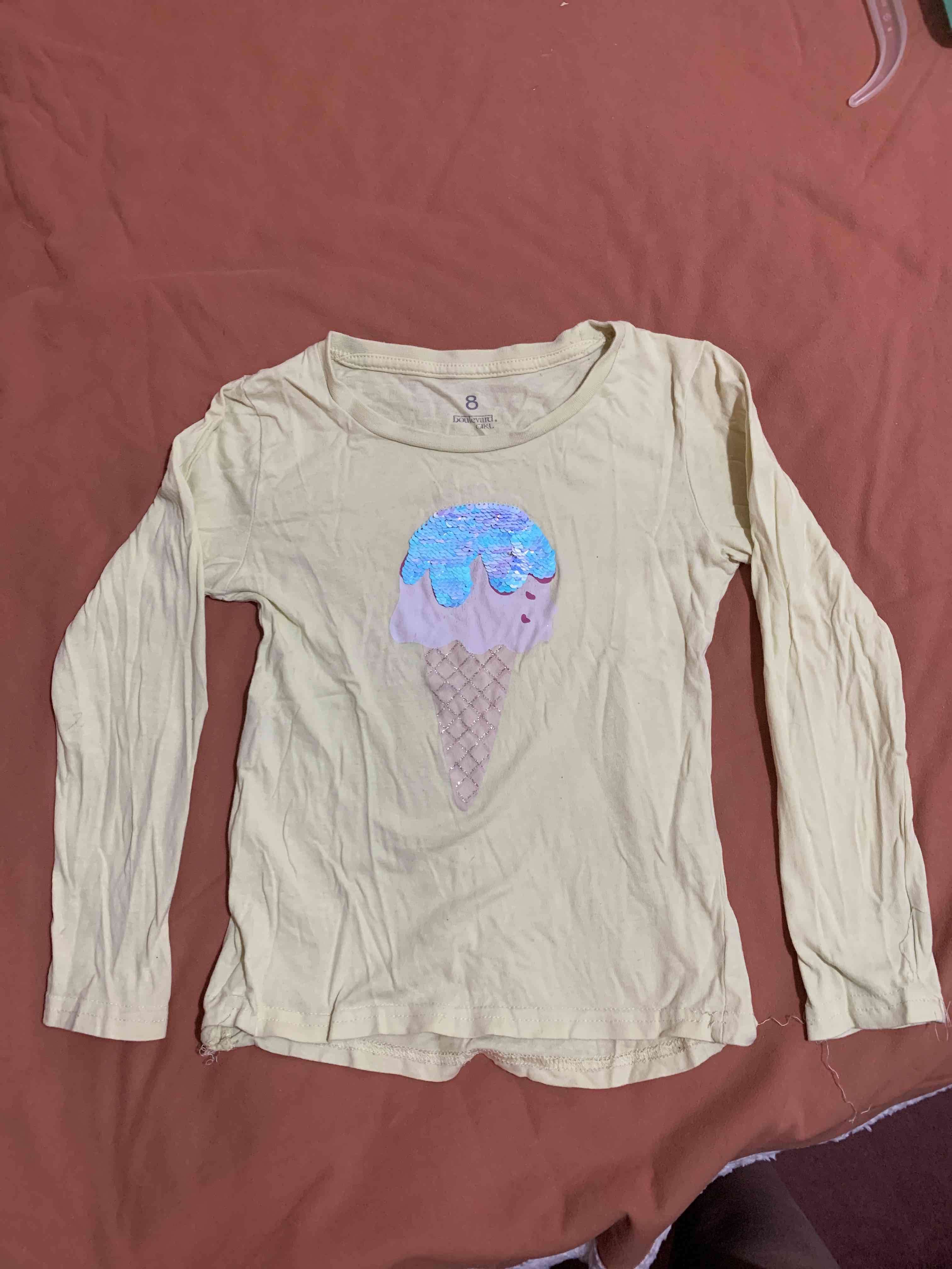 Polera amarilla con diseño de helado en lentejuelas que al subir o bajarlas cambia de color. Ideal para uso diario, presenta signos leves de uso. Talla 8