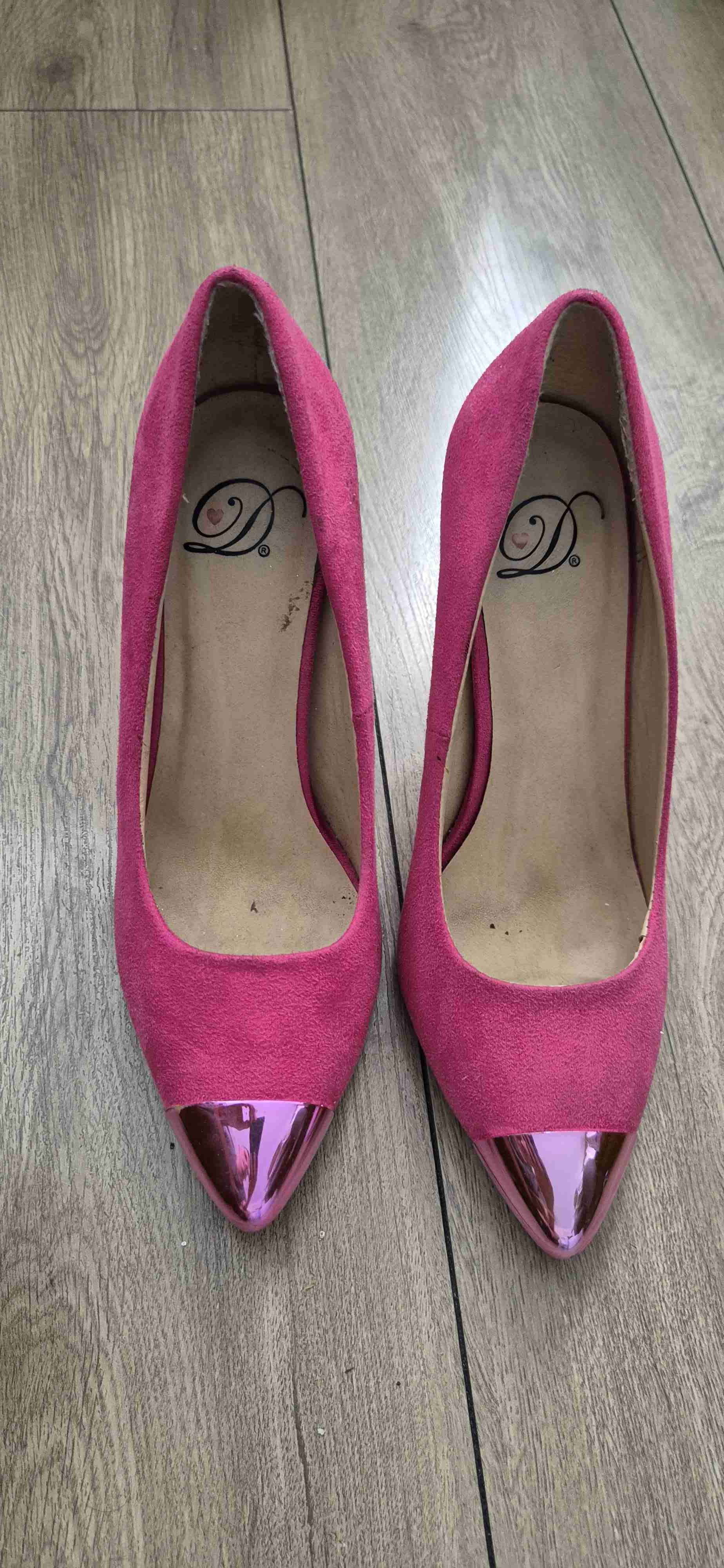 Elegantes zapatos de tacón en tono rosa con detalle metálico en la punta. En buen estado, perfectos para una salida especial.