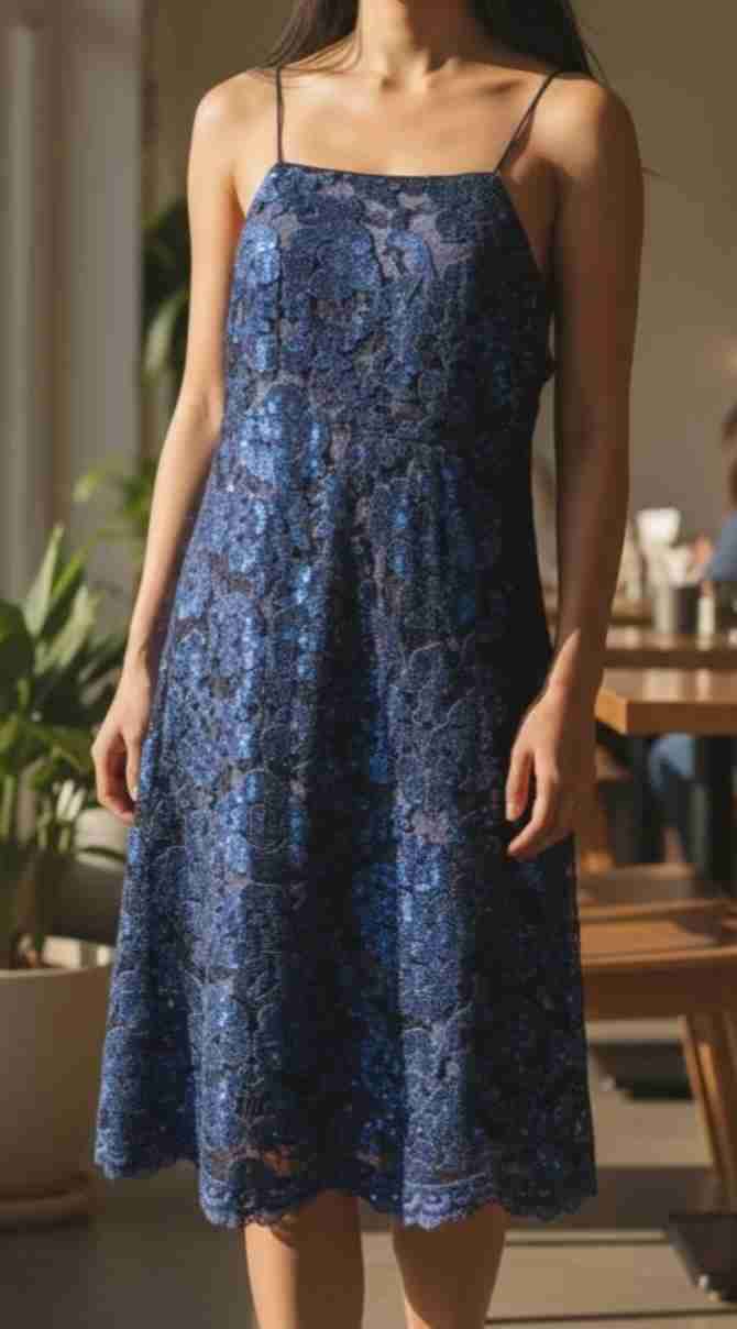 Vestido azul de encaje bordado lentejuelas, ideal para eventos formales, perfecto para ocasiones especiales.