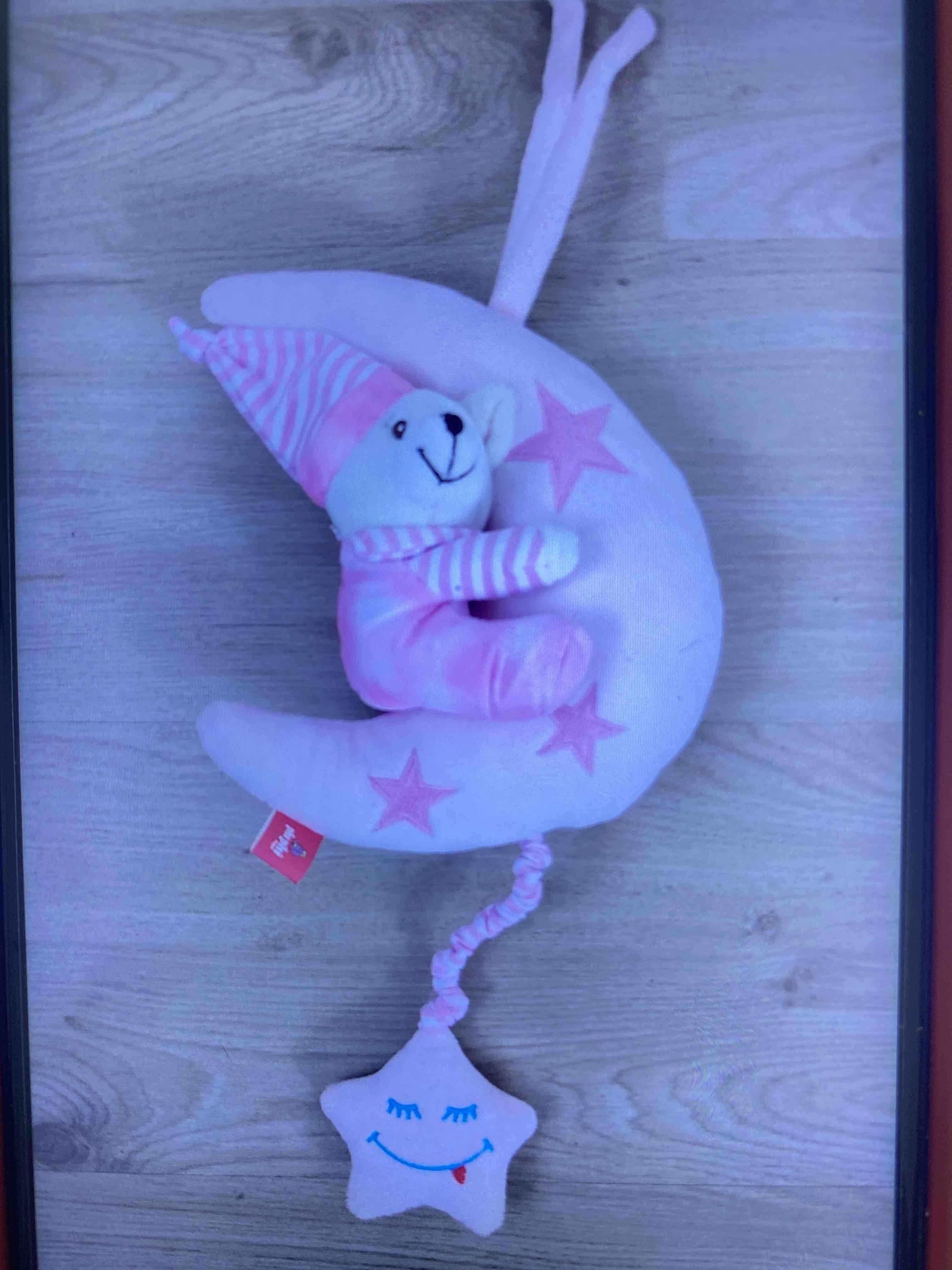 Adorable colgante de peluche en forma de luna con osito y estrella. Ideal para decorar la cuna o habitación de bebé.