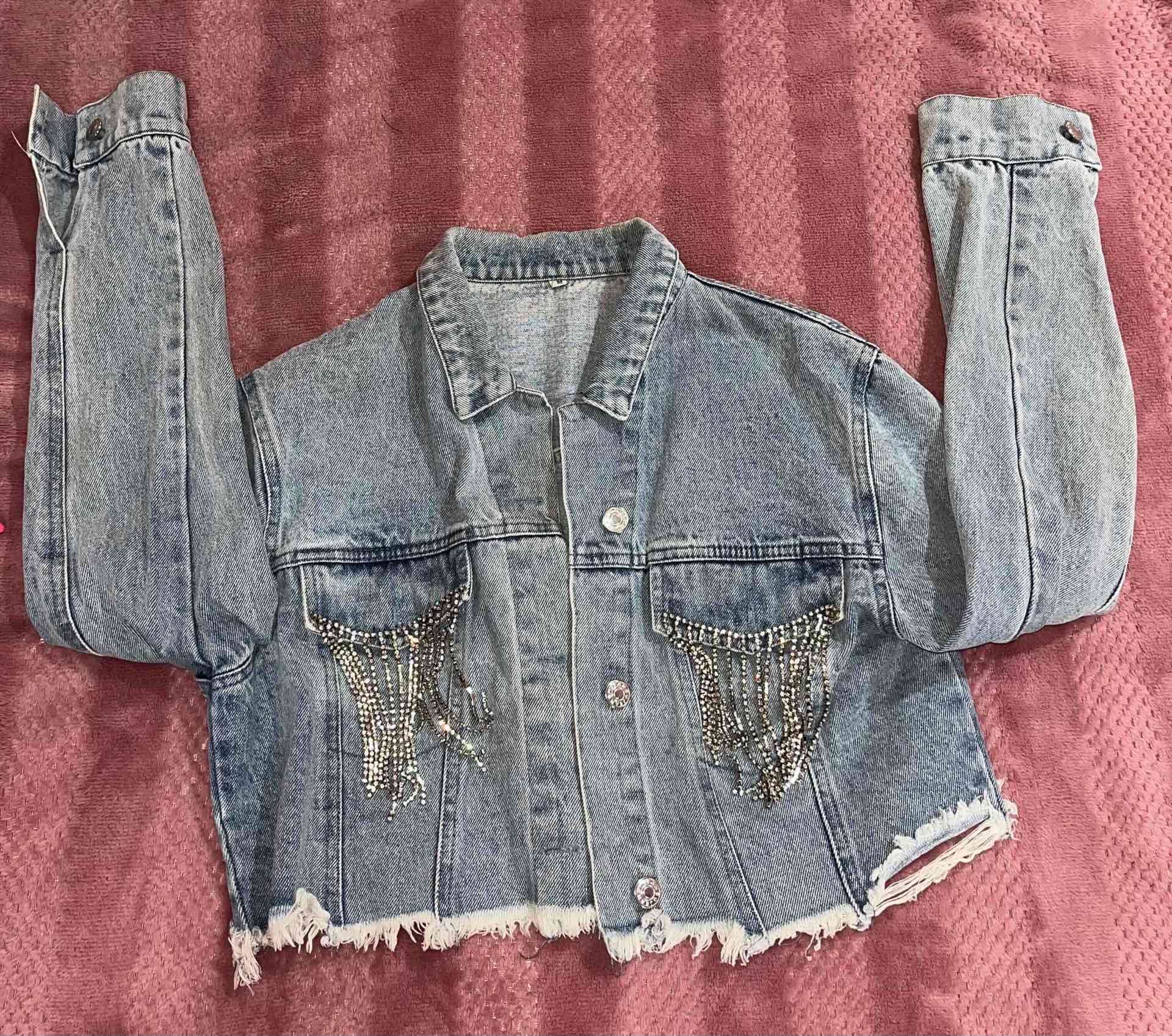 Chaqueta de mezclilla con flecos brillantes en los bolsillos. Ideal para un look casual y moderno. En buen estado.