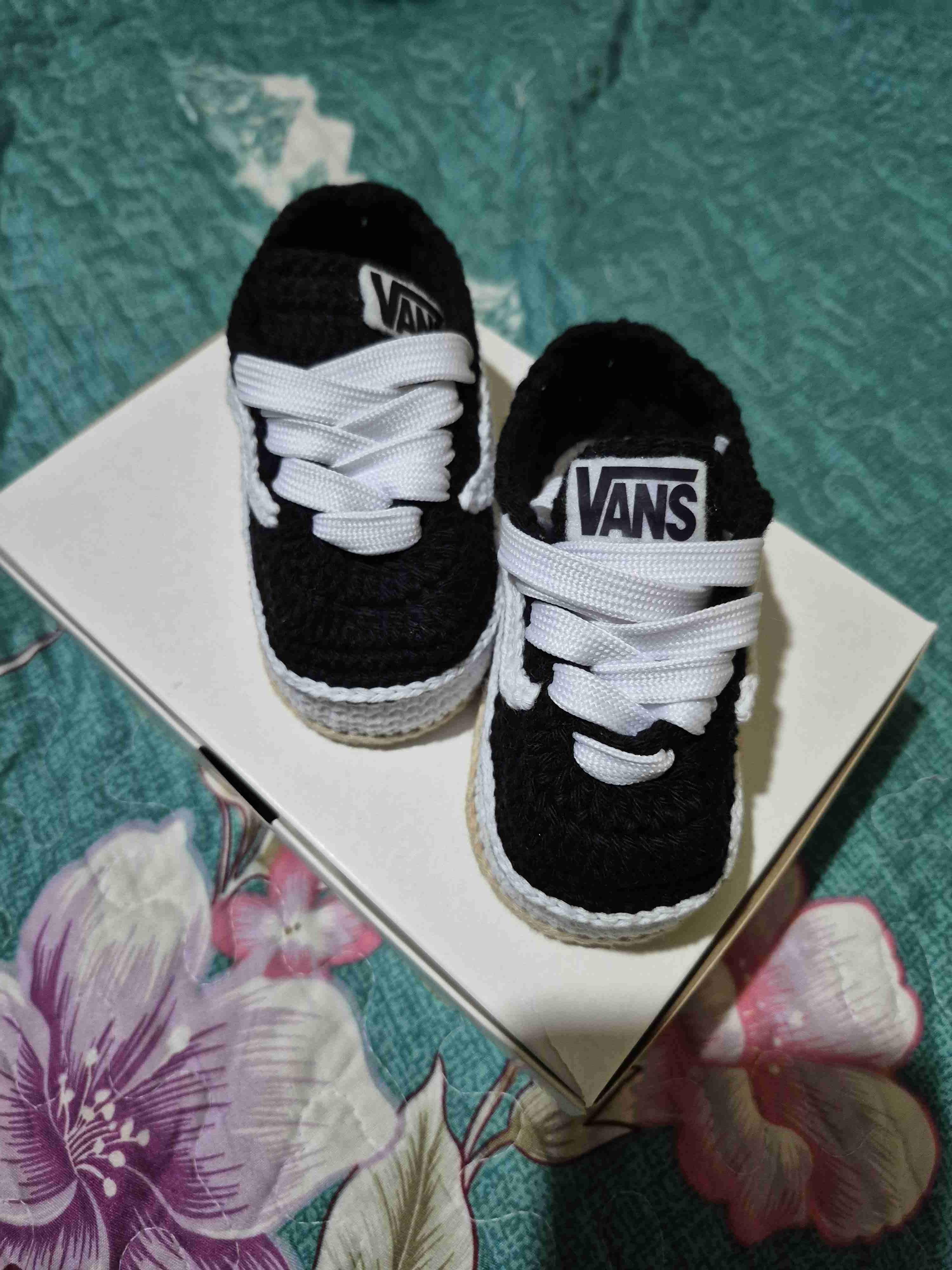 Zapatillas tejidas a crochet para bebé estilo Vans en color negro con blanco. Ideales para este invierno y llevar un look casual y cómodo. Para 6 a 9 meses,para piecitos hasta los 11cm.