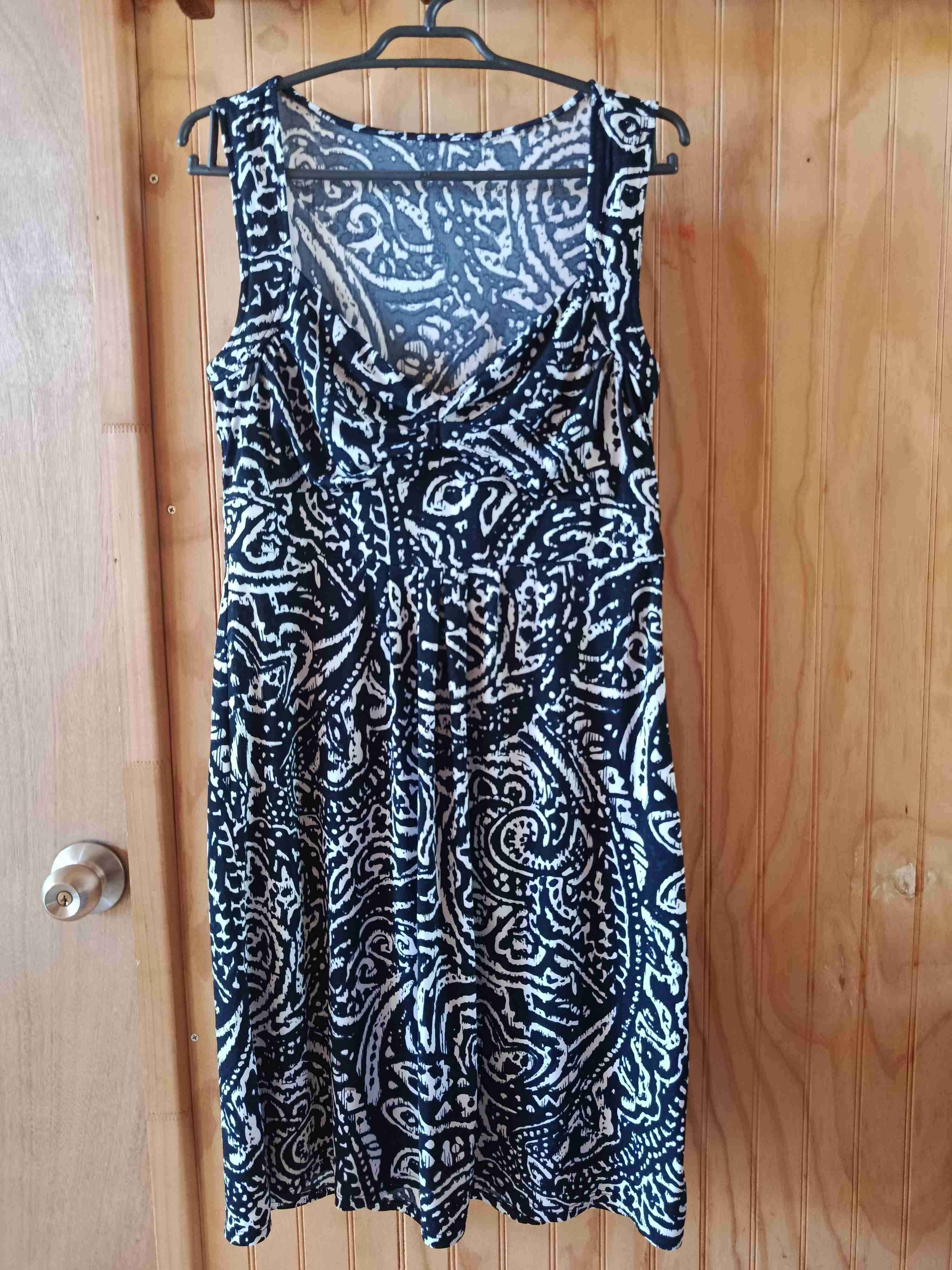 Elegante vestido con estampado abstracto en blanco y negro, ideal para ocasiones casuales. Se encuentra en buen estado. Talla M