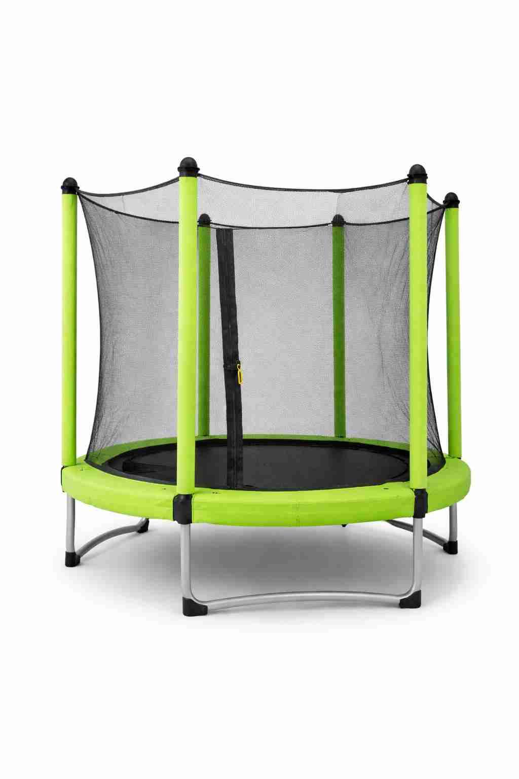 Trampolín redondo color verde, ideal para jugar al aire libre. Incluye red de seguridad.
