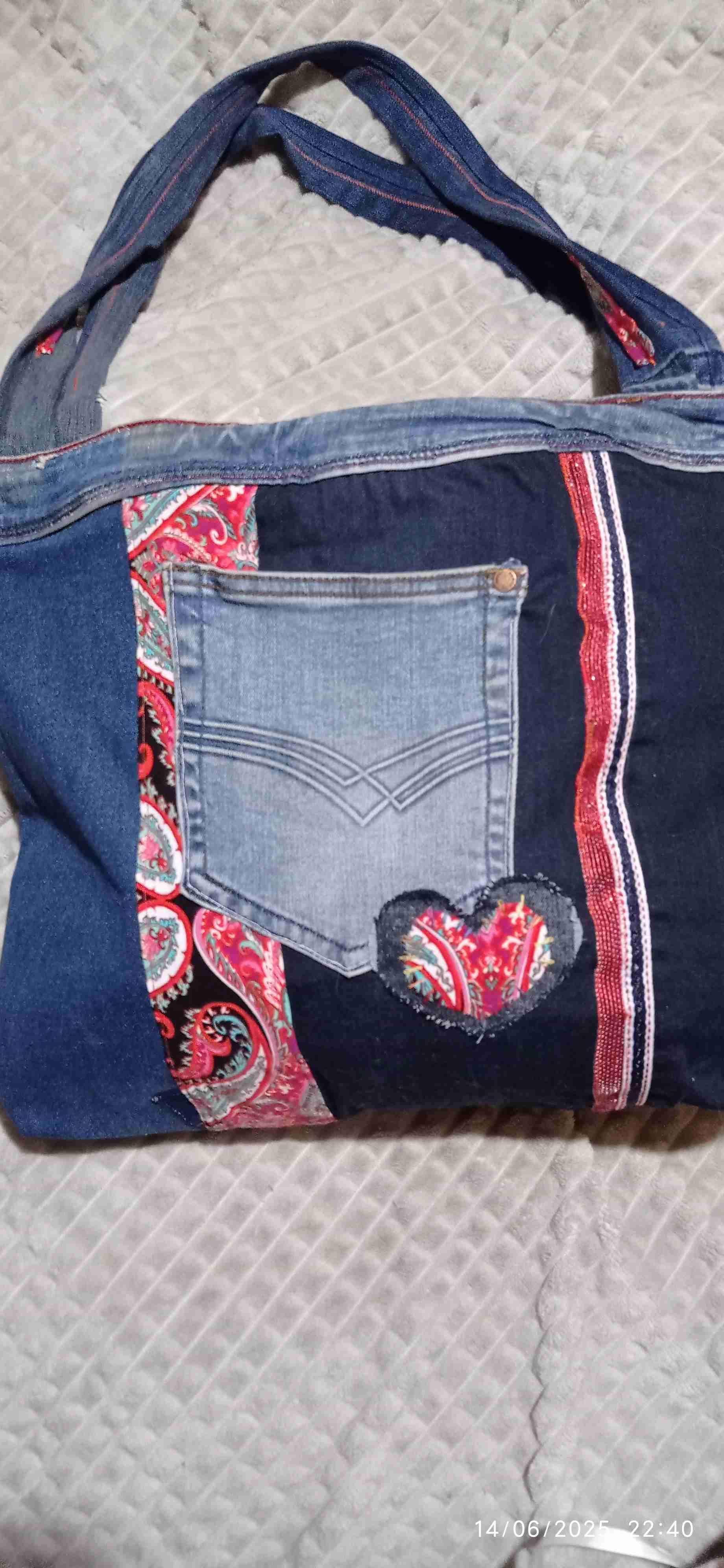 Bolso hecho a mano con tela reciclada de jeans.con cierre y bolsillos internos, muy firmeDiseño único con detalles coloridos. Ideal para el uso diario.