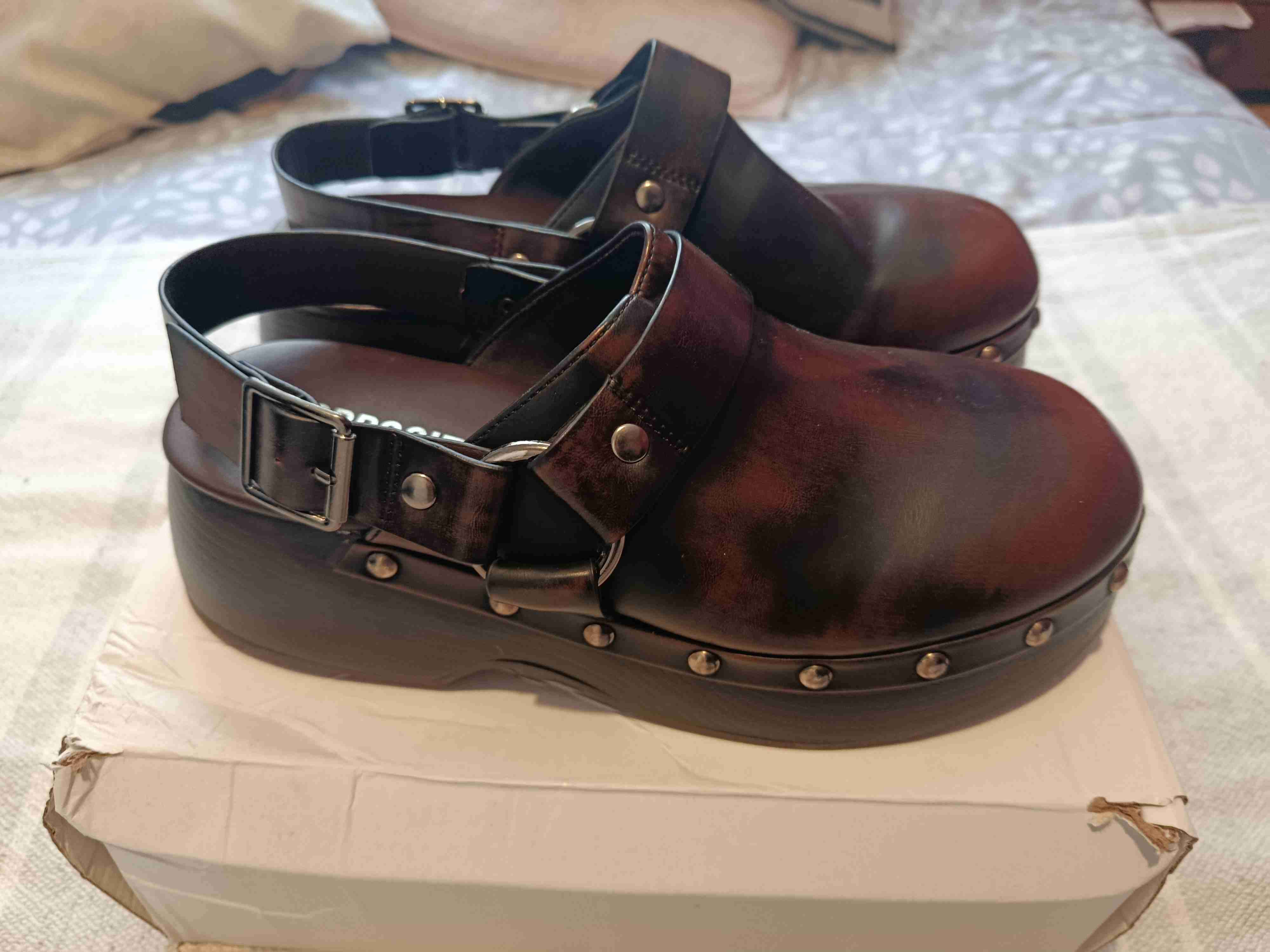 Zuecos de cuero marrón con detalles de tachas, estilo casual y cómodo. En buen estado, ideal para el uso diario.
