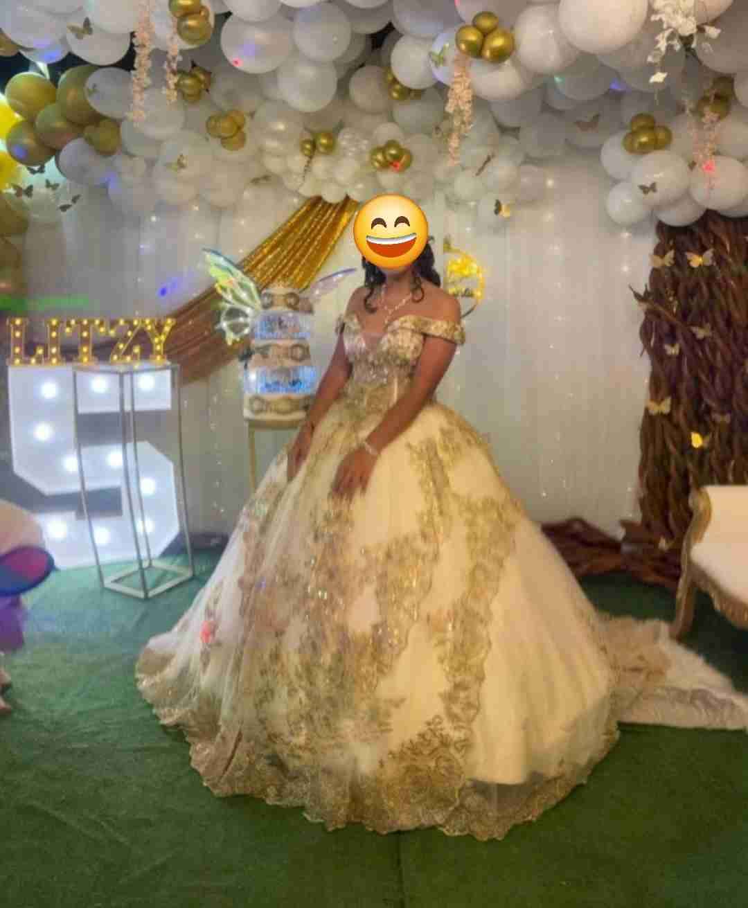 Elegante vestido de fiesta en color dorado con detalles brillantes. Ideal para quinceañeras se vende con todo y falso está en muy buen estado