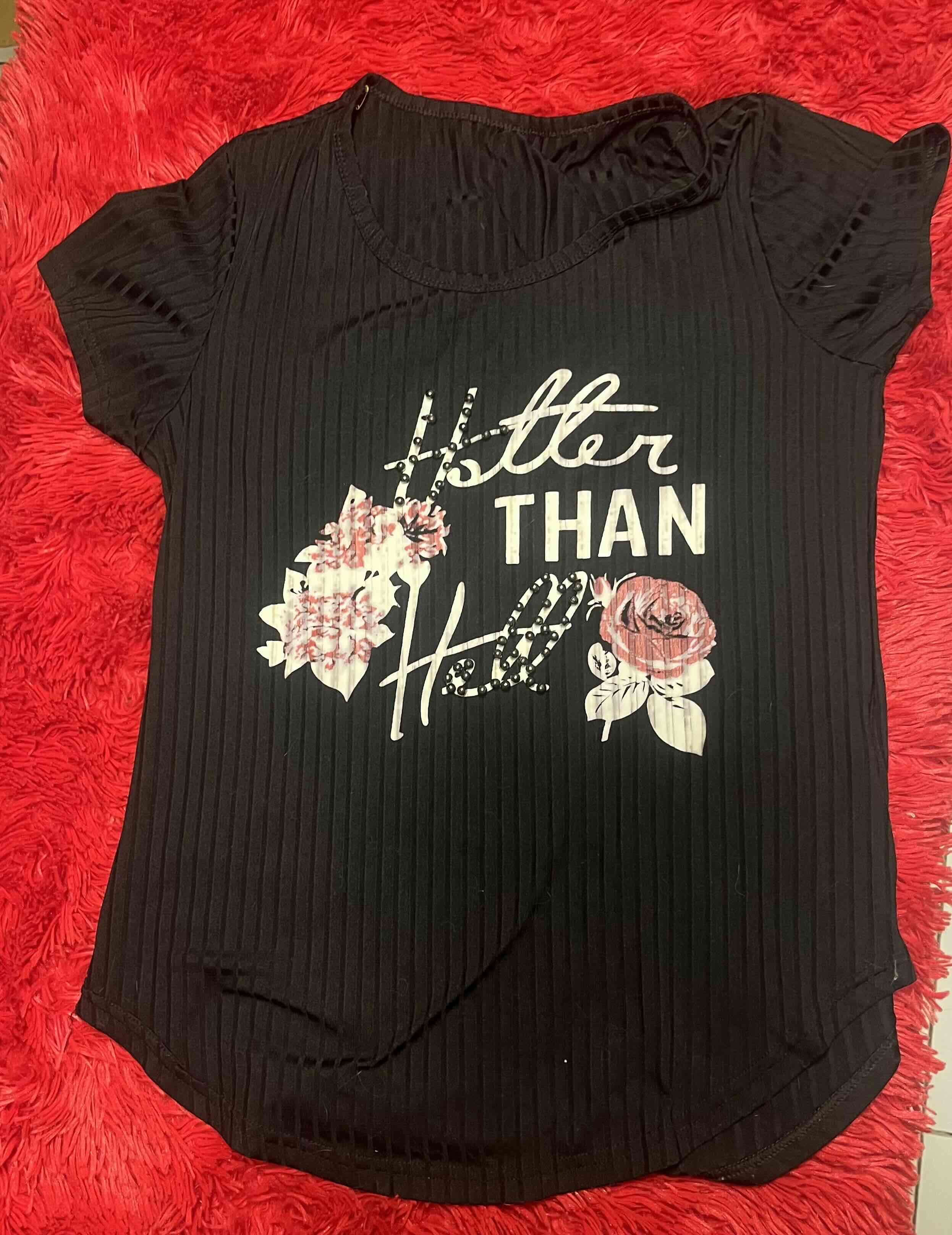 Cómoda polera negra con diseño de flores y texto estampado. En buen estado general, ideal para uso diario o casual.