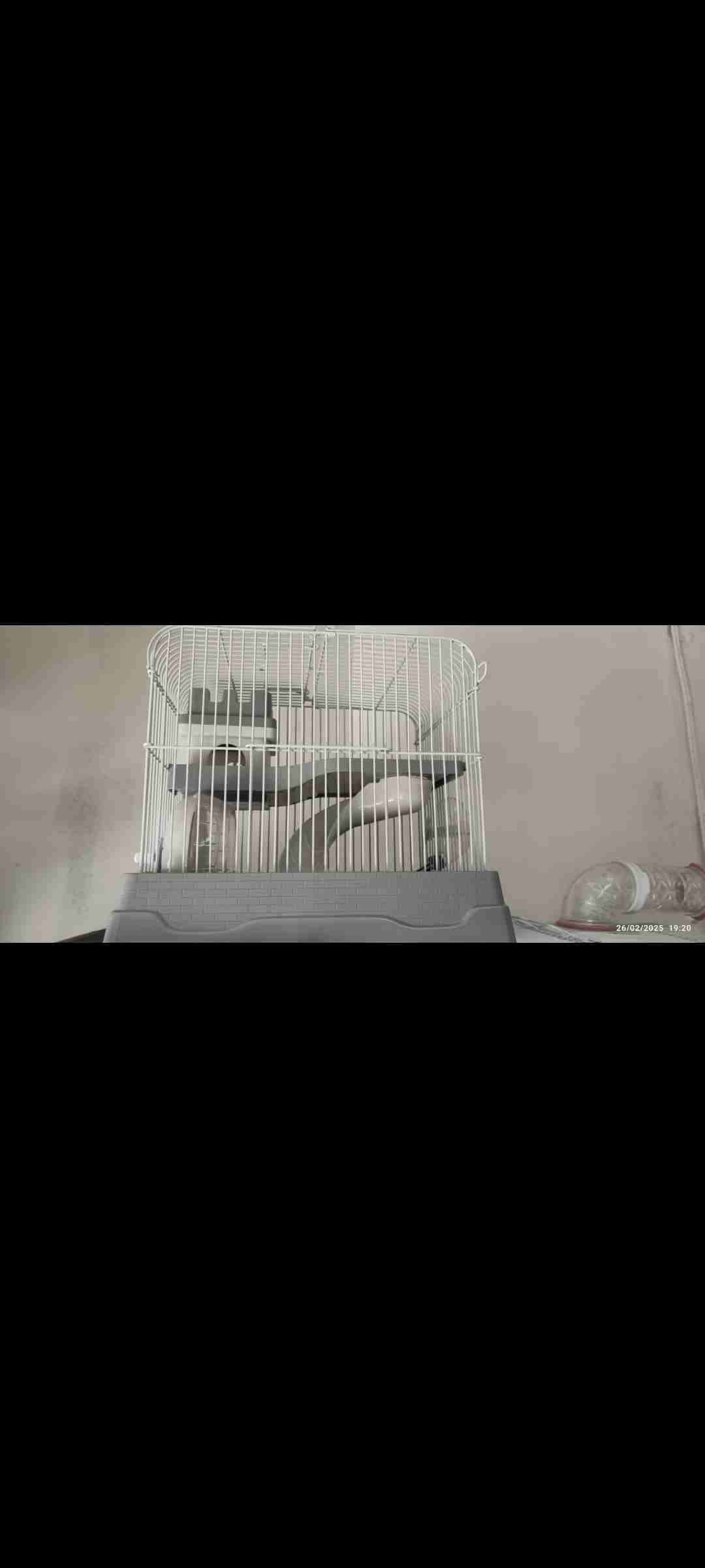 Jaula blanca con bandeja gris, ideal para hámsters o roedores. En buen estado, espaciosa y con accesorios.