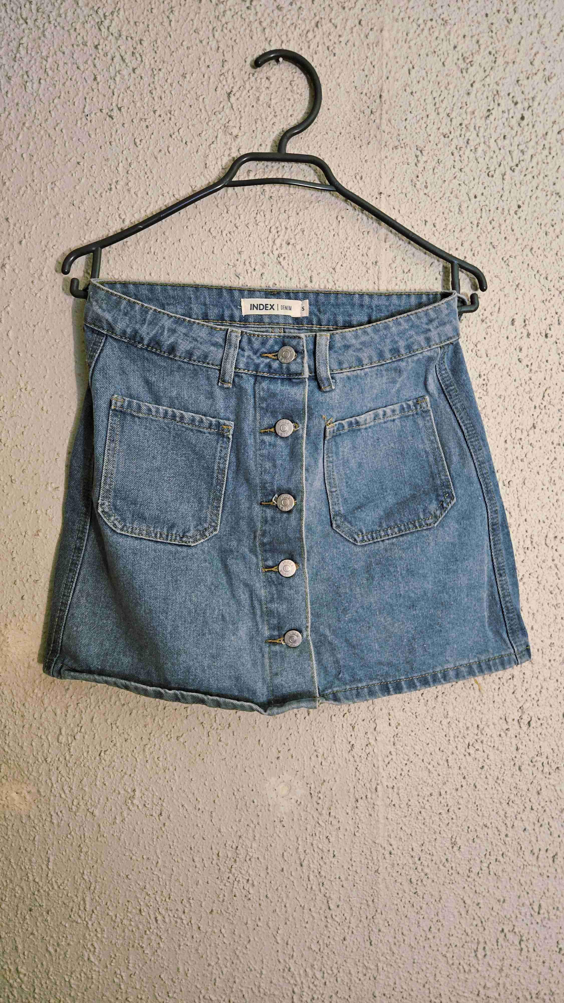 Falda de mezclilla azul en buen estado, ideal para un look casual. Botones frontales y bolsillos prácticos. TALLA S INDEX.