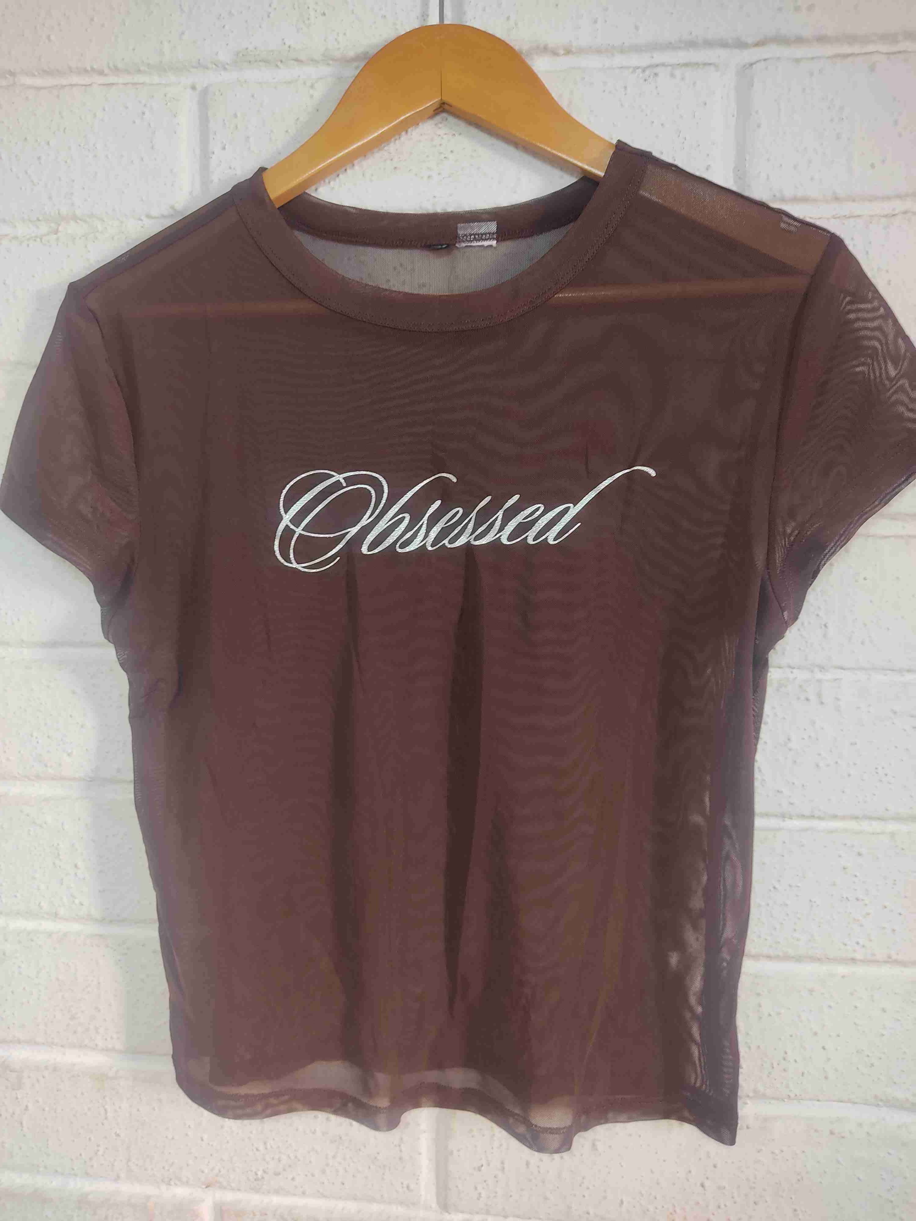 Polera marrón de malla transparente con estampado 'Obsessed'. Ideal para un look casual y moderno.