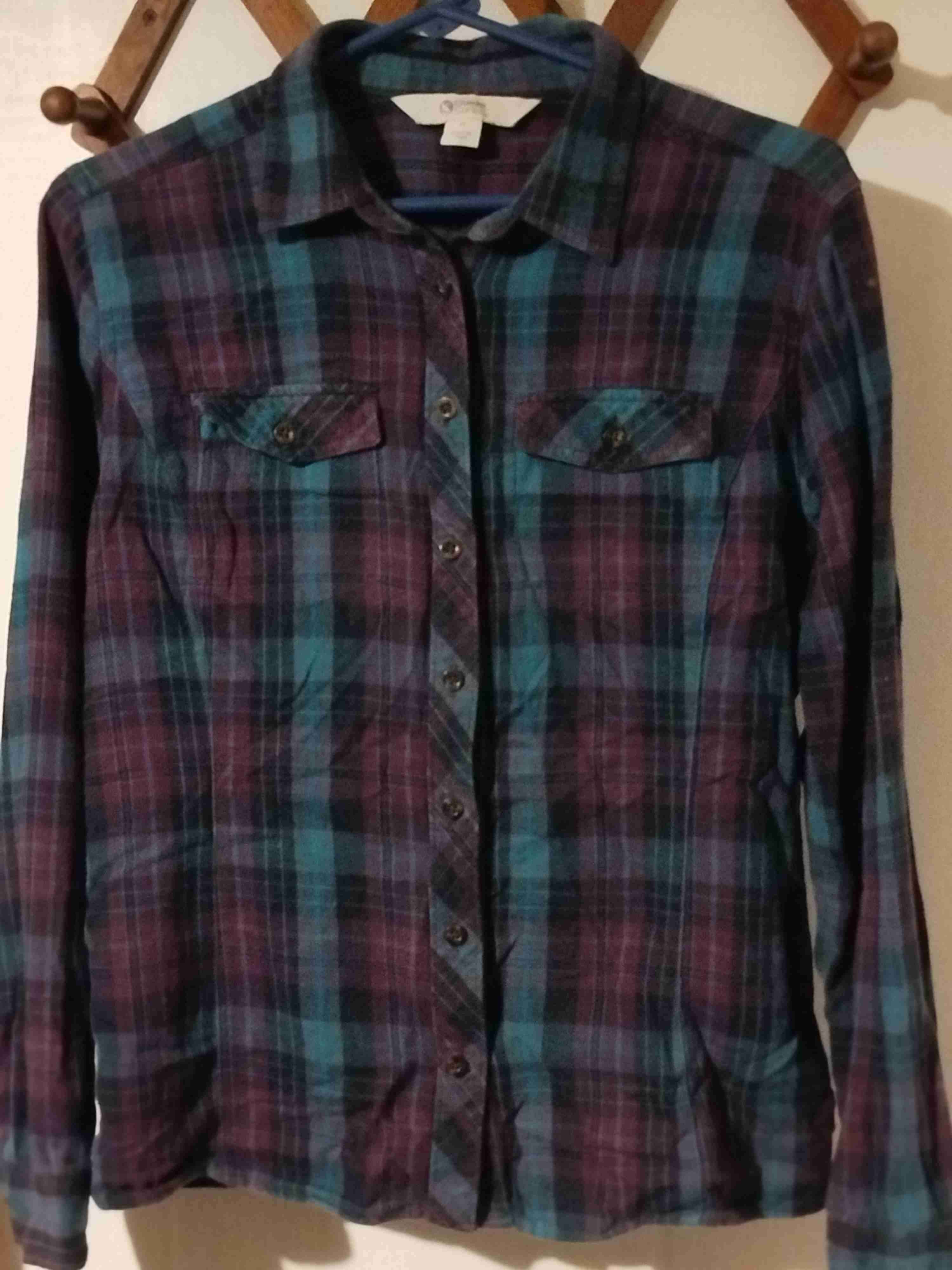 Camisa de franela en tonos morados y azules, ideal para días frescos. En buen estado con pequeños signos de uso.