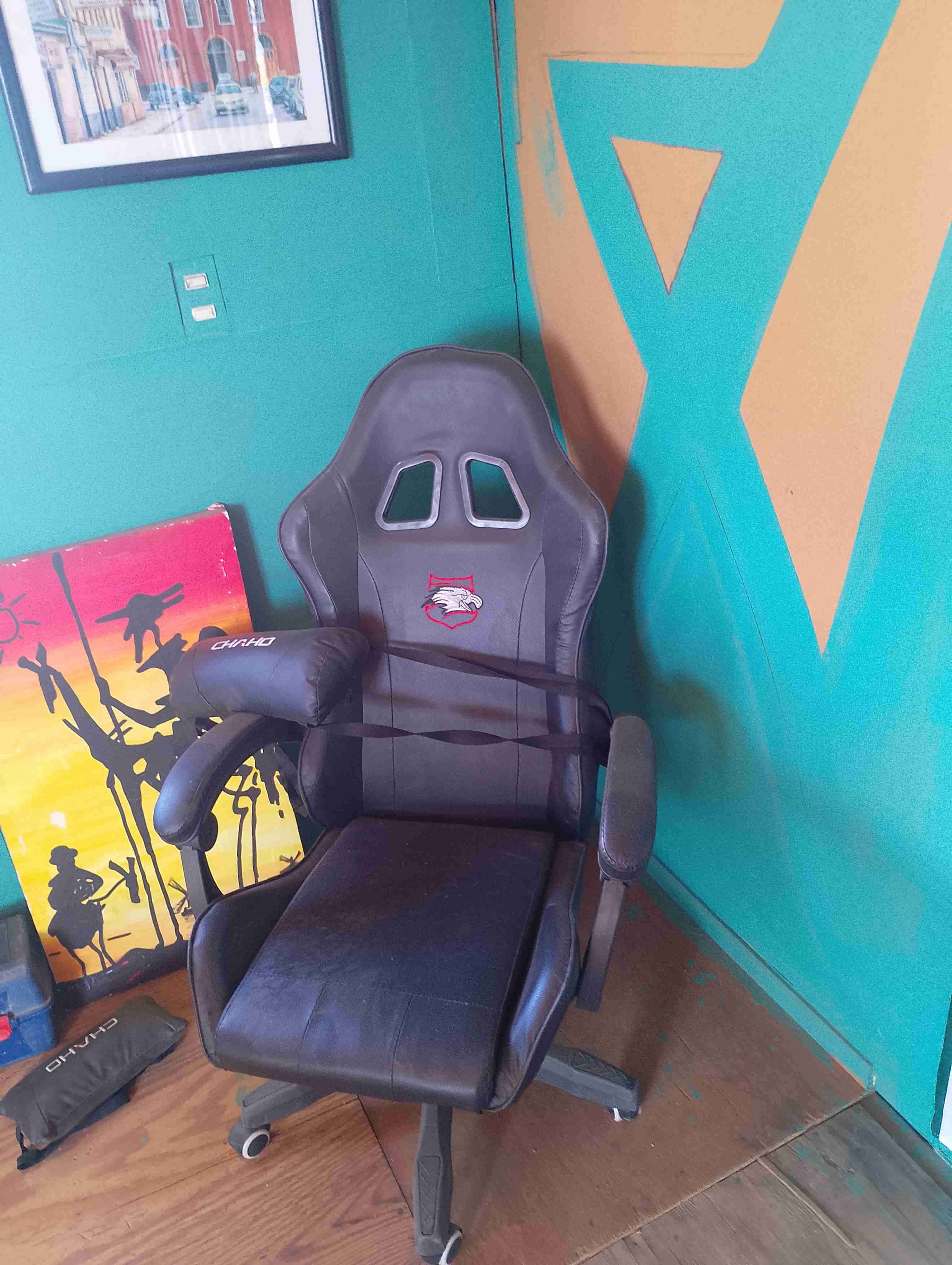 Silla gamer negra con reposabrazos ajustables, en buen estado. Ideal para largas sesiones de juego o trabajo.