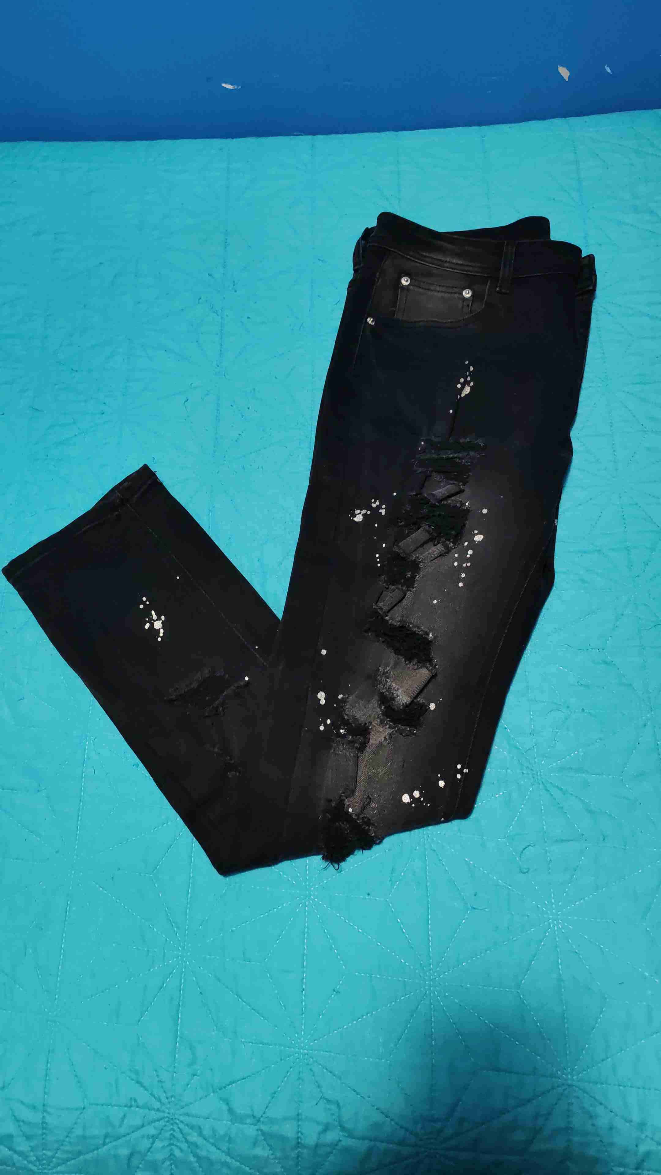 Jeans estilo desgastado de color negro con detalles rasgados y manchas decorativas. En buen estado general, ideal para un look casual.