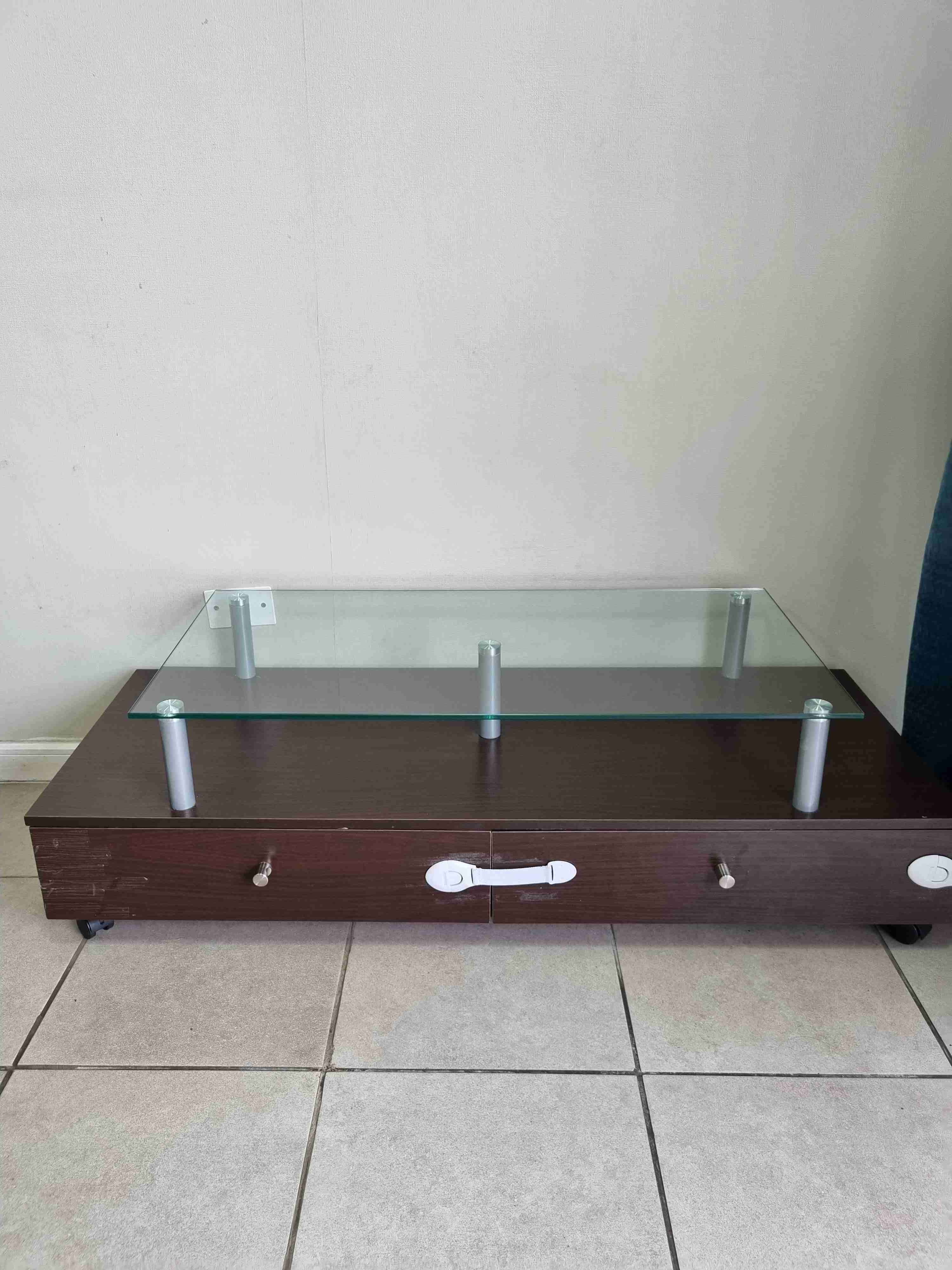 Elegante mesa de centro de madera con vidrio templado soporta hasta 120 kg tiene ruedas y dos cajones, ideal para sala de estar. En buen estado, con algunos detalles menores.