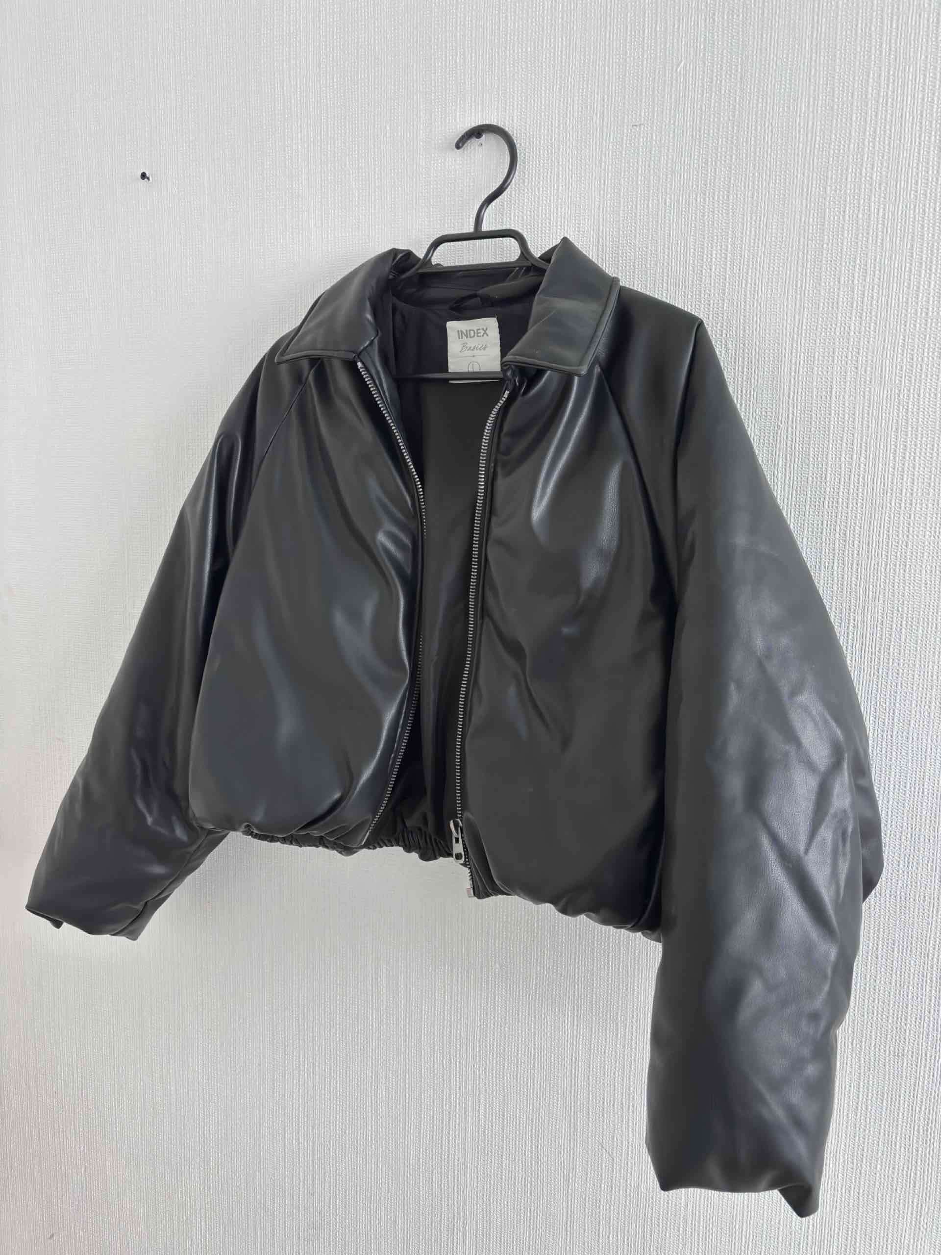 Chaqueta corta negra de material sintético, estilo moderno y juvenil. Ideal para combinar con jeans o faldas. En buen estado general.