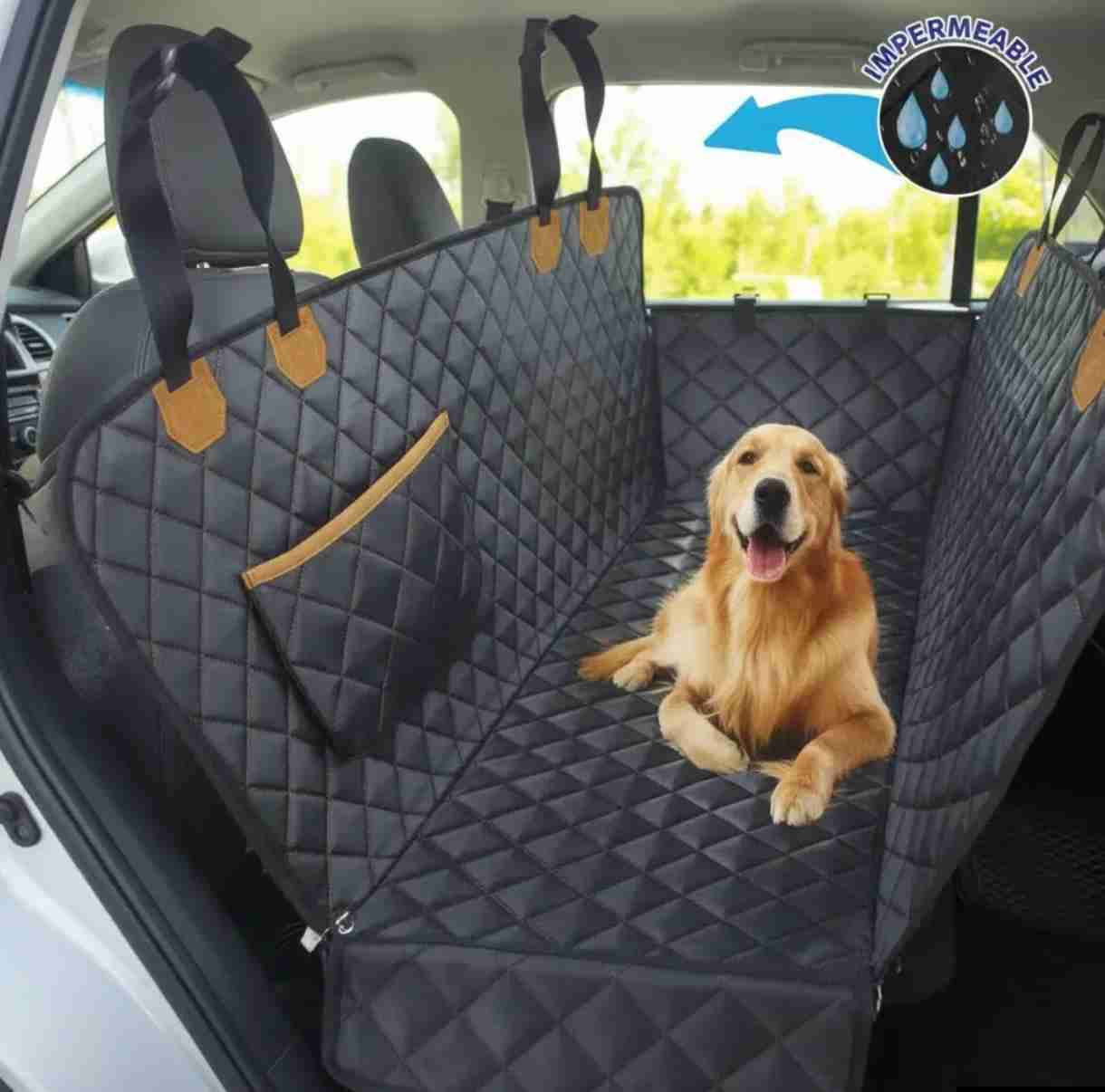 Protector de asiento para auto, ideal para mascotas. Material resistente e impermeable. Fácil de instalar y limpiar.