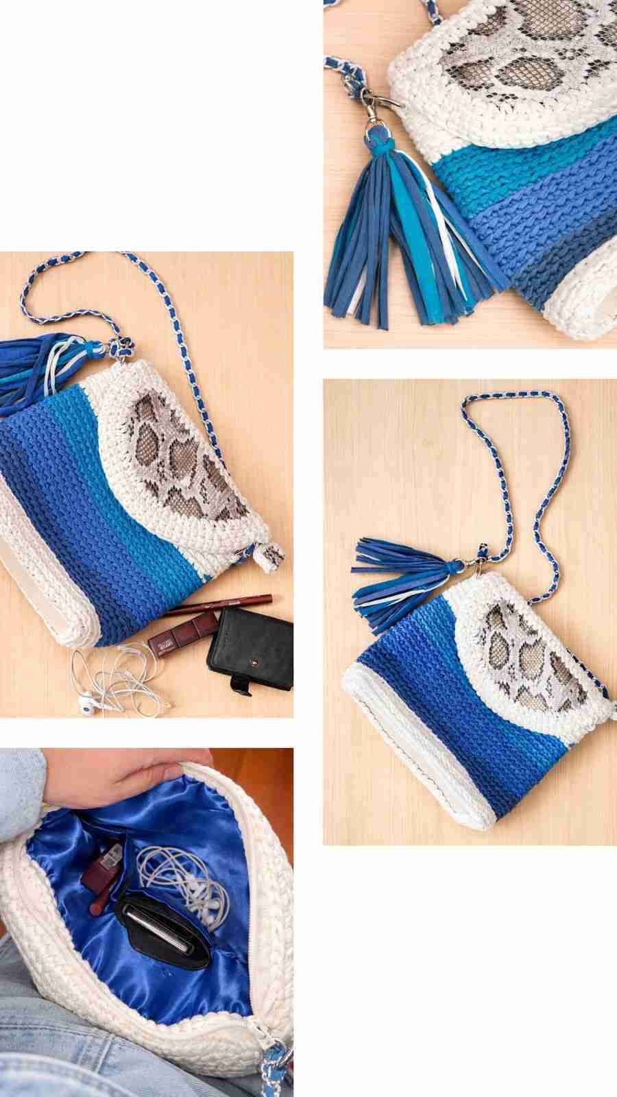 Cartera tejida a mano en azul y blanco con diseño serpiente. Ideal para uso casual y elegante. Nuevo .