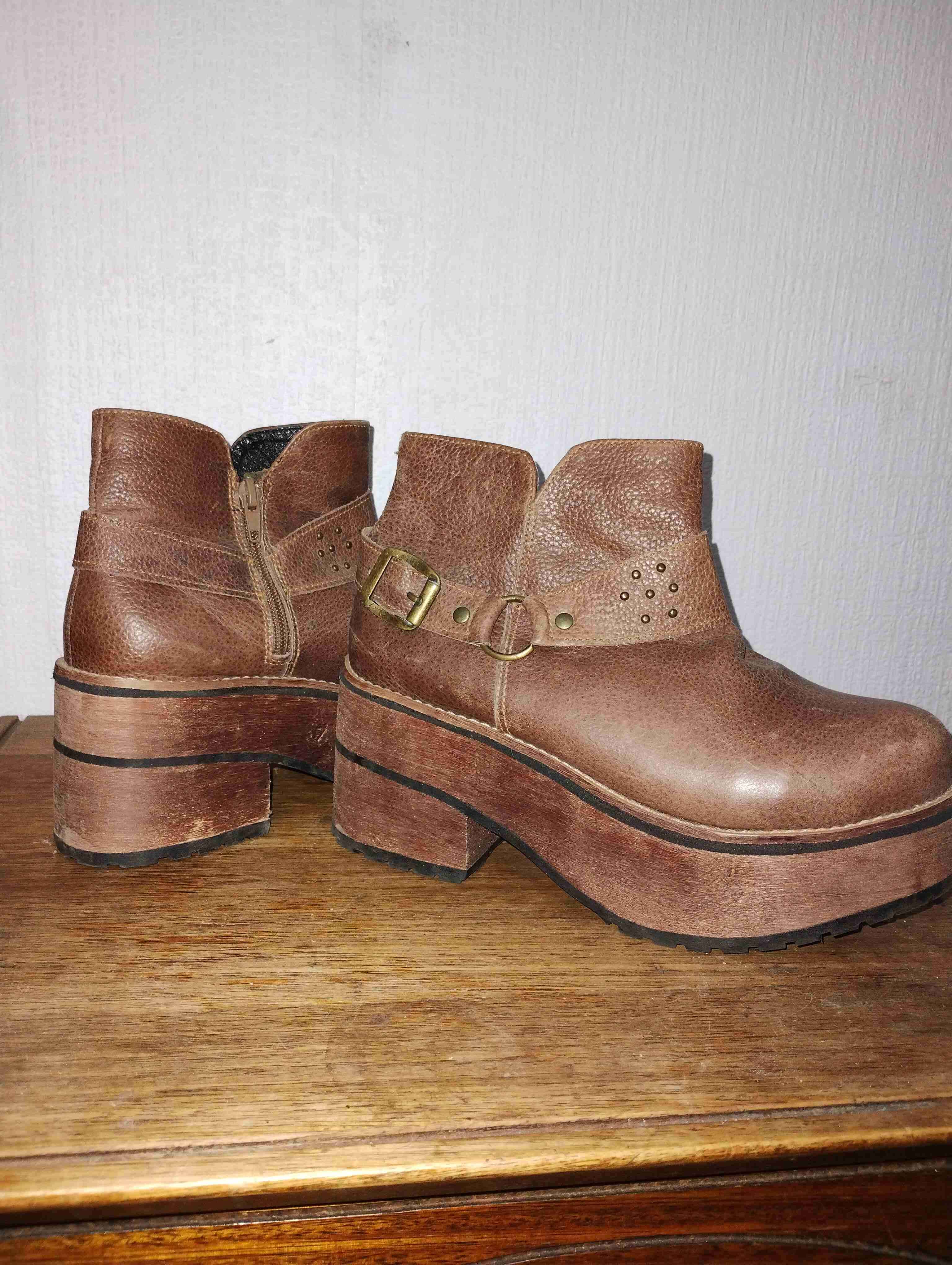 Botines de cuero marrón, estilo robusto con plataforma alta. Buen estado general, ideal para looks casuales y urbanos.