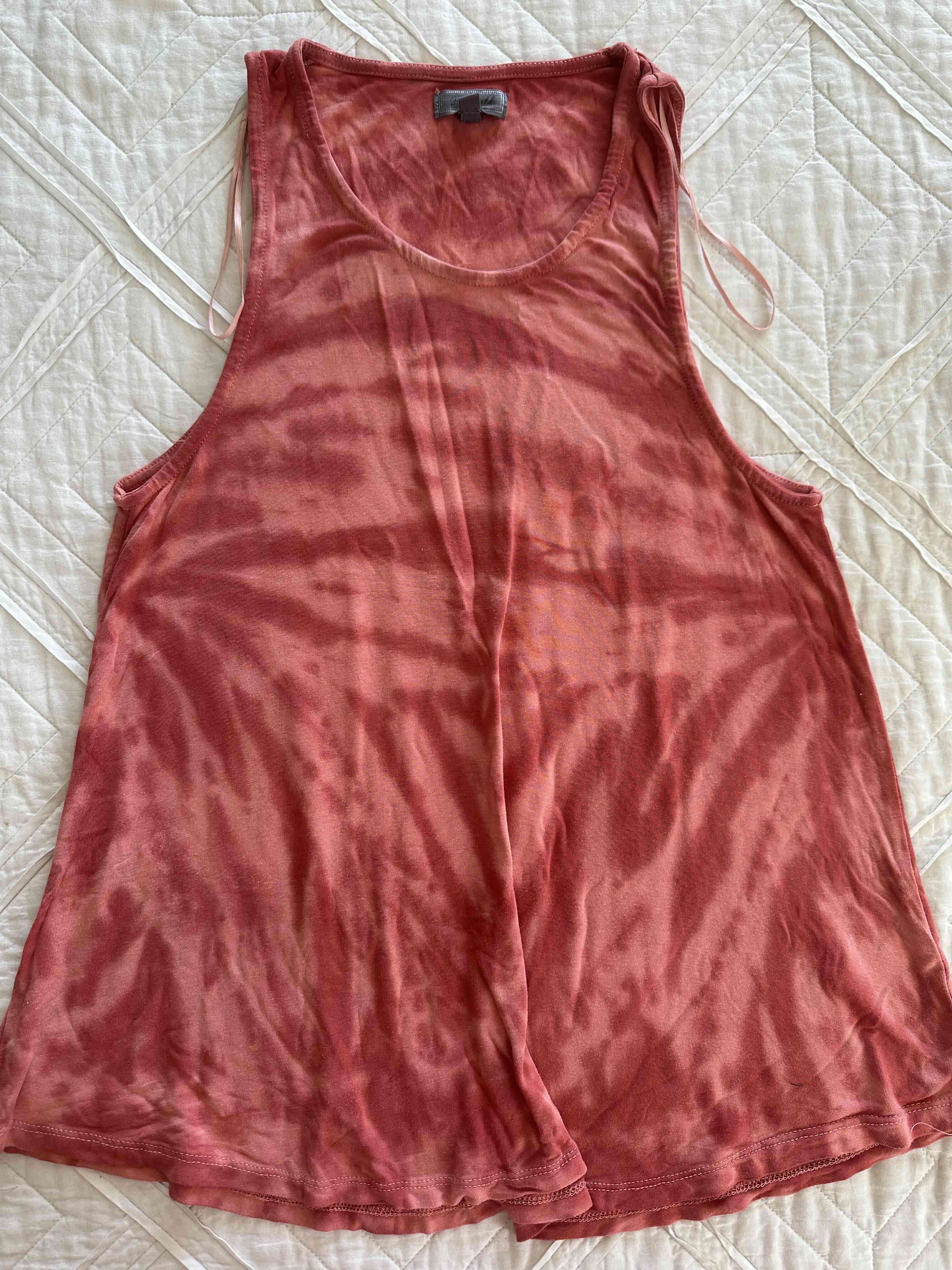 Polera casual de estilo tie-dye en tonos rojos, perfecta para días cálidos. En buen estado, ideal para un look relajado.
