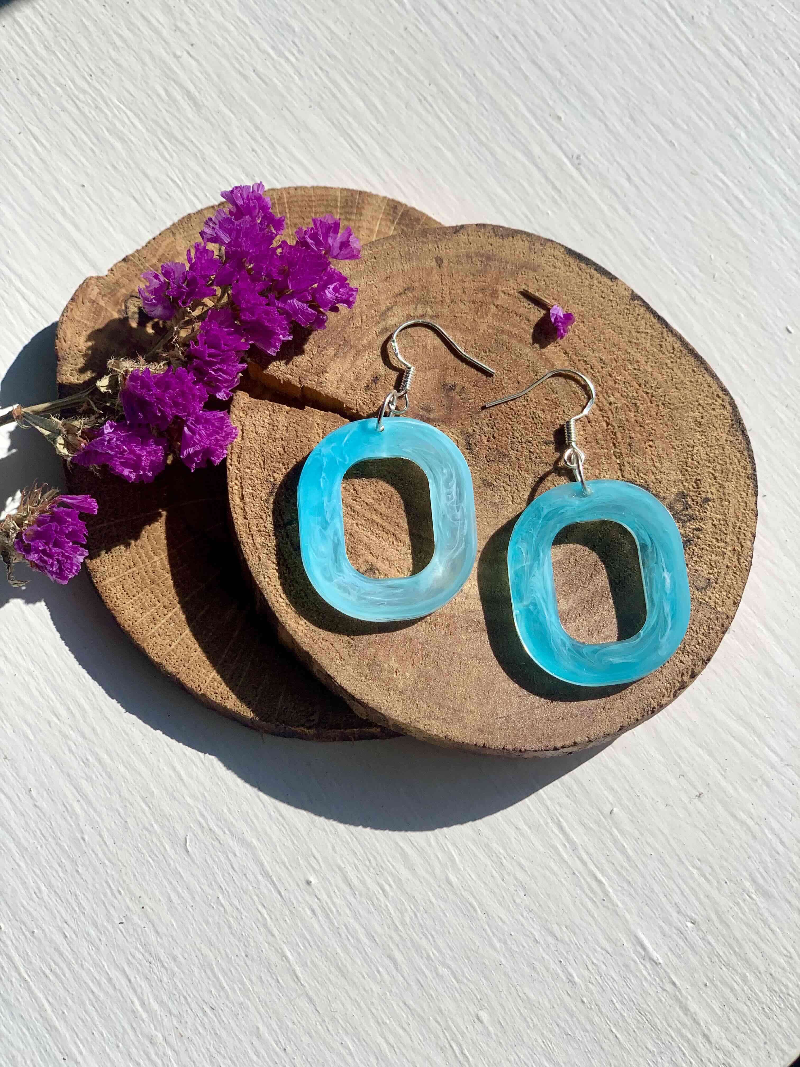 Aros colgantes de color celeste, diseño moderno y liviano. Ideales para complementar tu look diario. Diseño en resina, base de plata 925