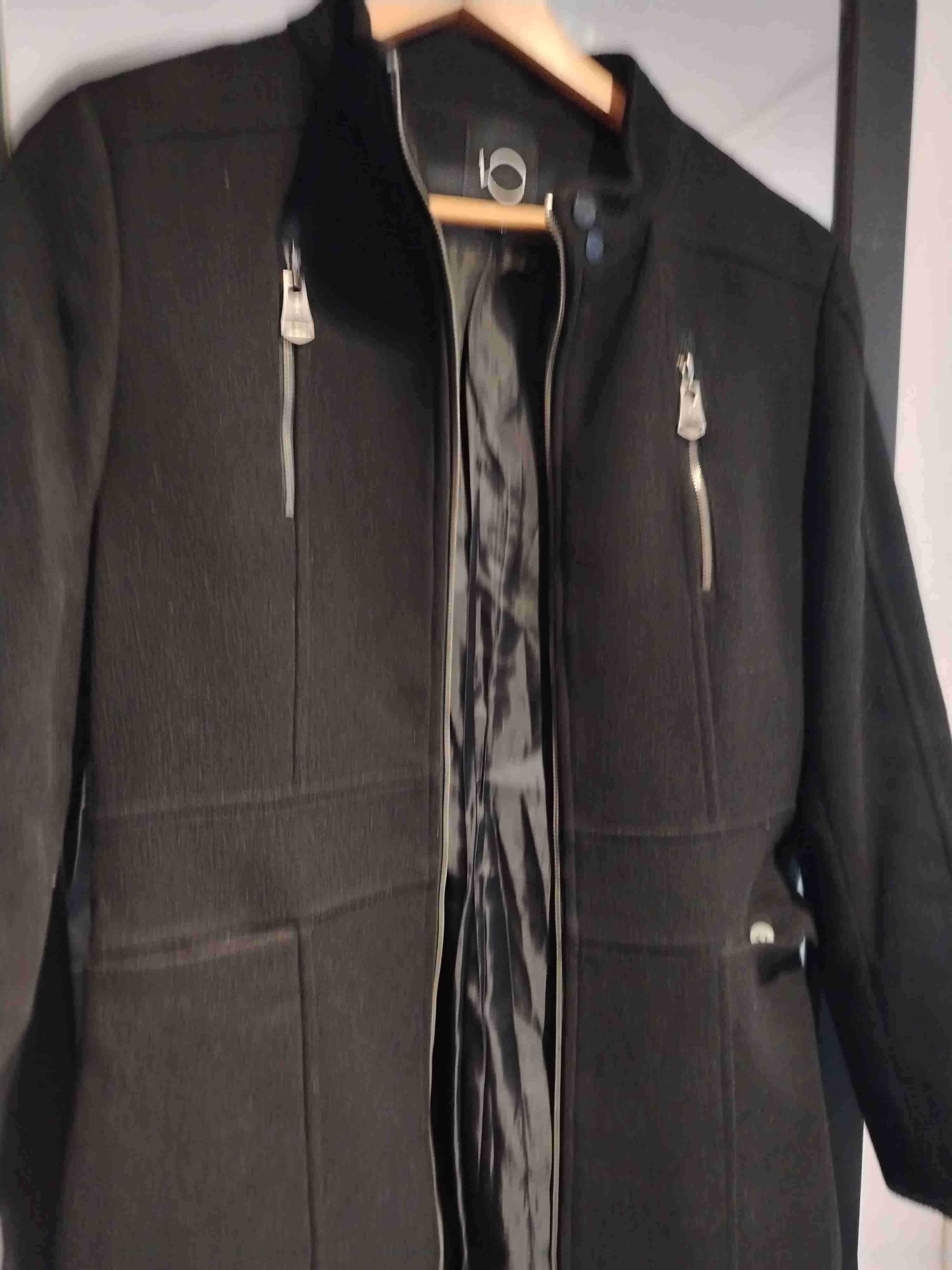 Abrigo negro elegante, ideal para el invierno. En buen estado, con cierre frontal y detalles de calidad.