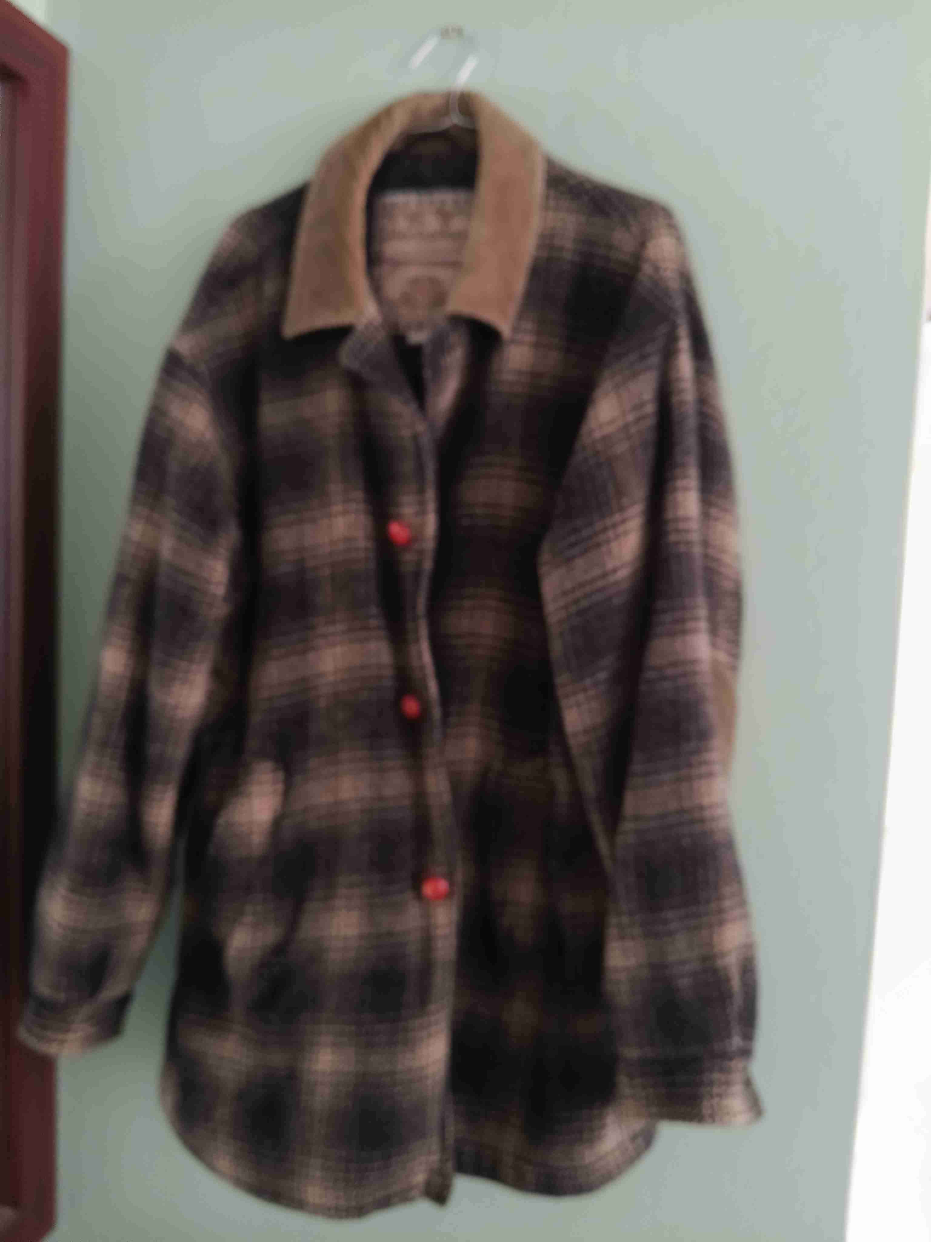 Abrigo a cuadros marrón con botones rojos, ideal para el invierno. En buen estado, con signos leves de uso.