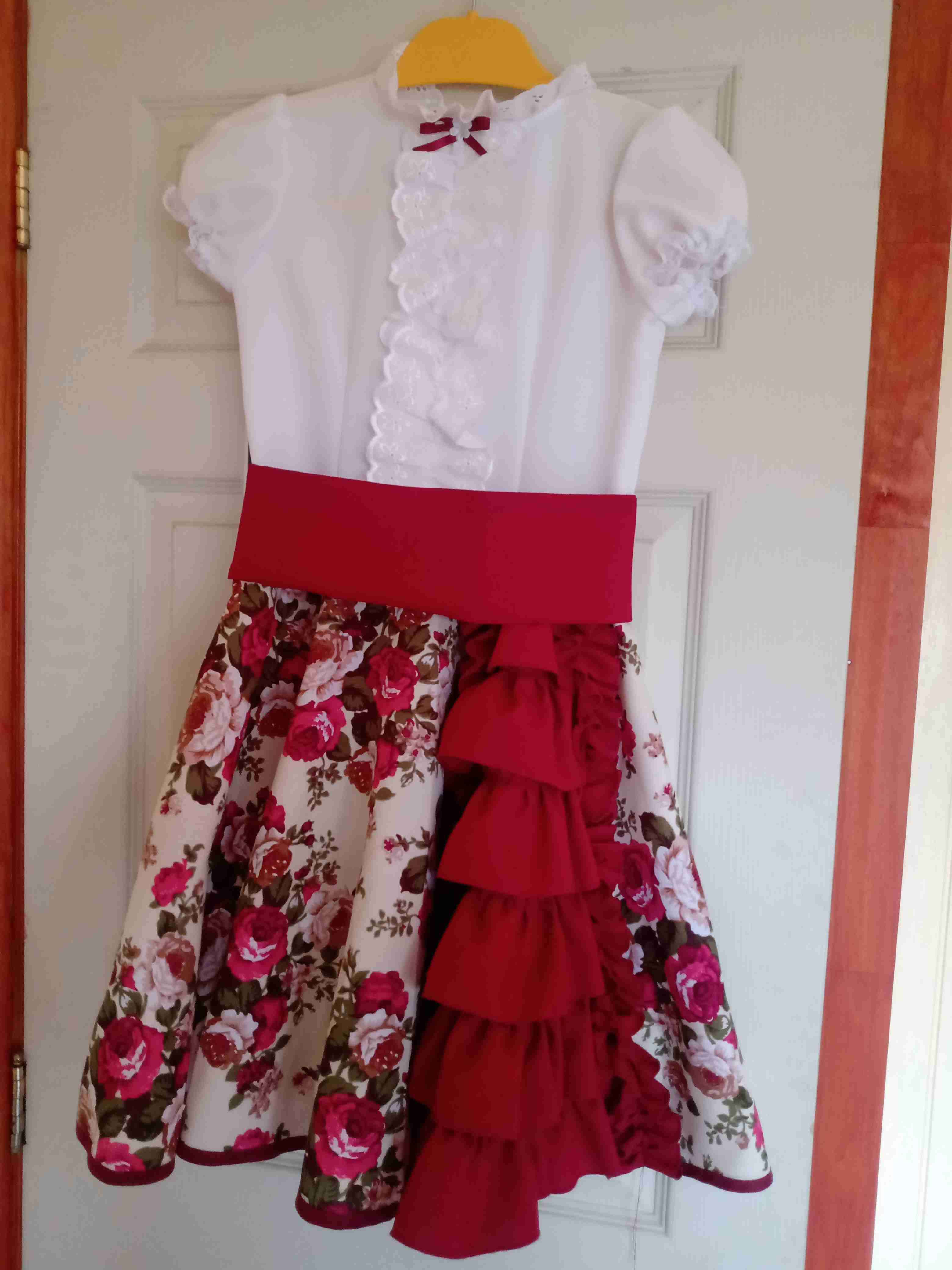 Vestido folclórico con diseño floral y volantes, ideal para fiestas tradicionales. En buen estado y colorido. Perfecto para eventos culturales, cintura 72 cm, largo 84 cm