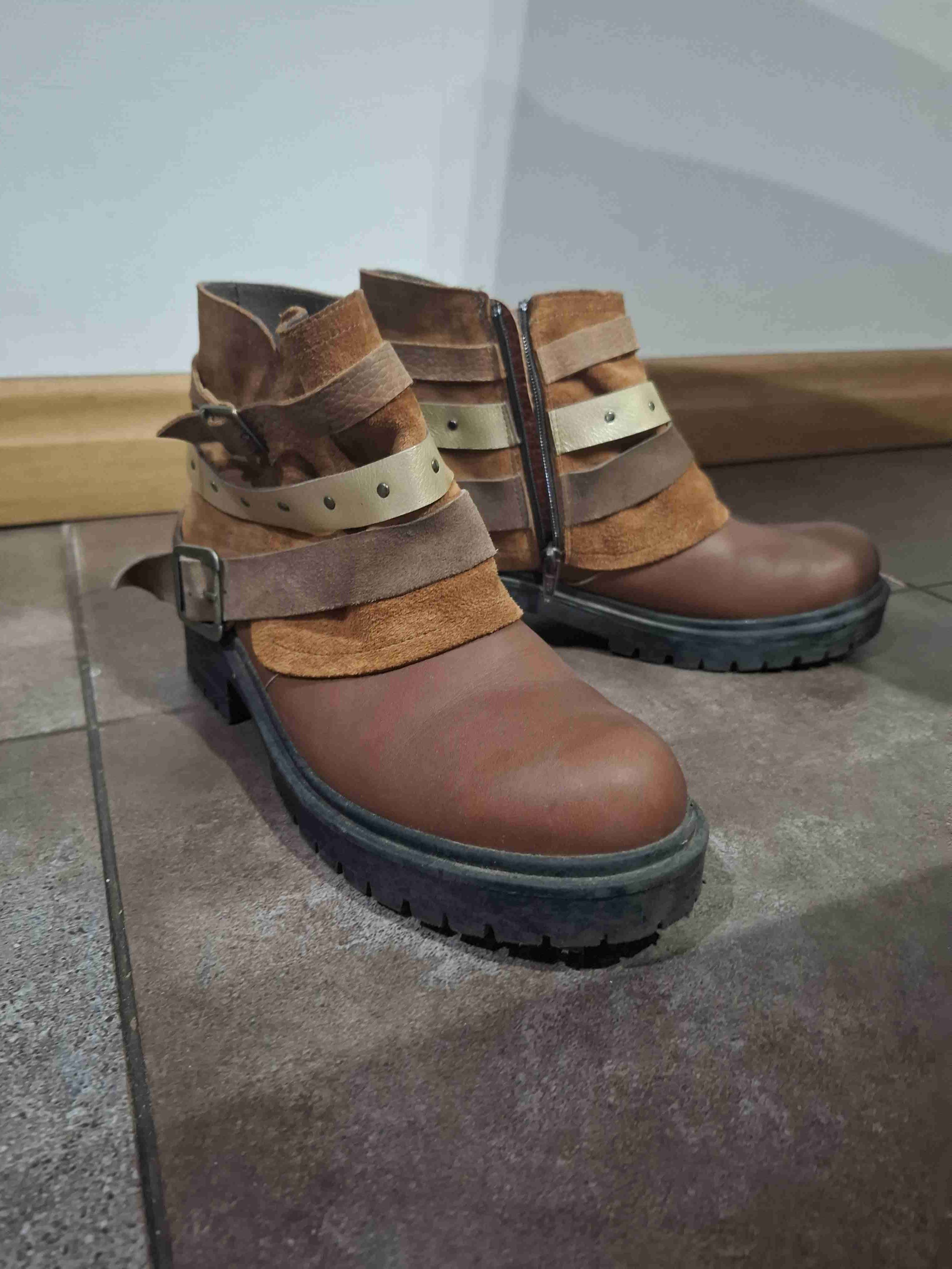Botas de cuero en color marrón con tiras decorativas. En buen estado, ideal para estilo casual o outdoor.