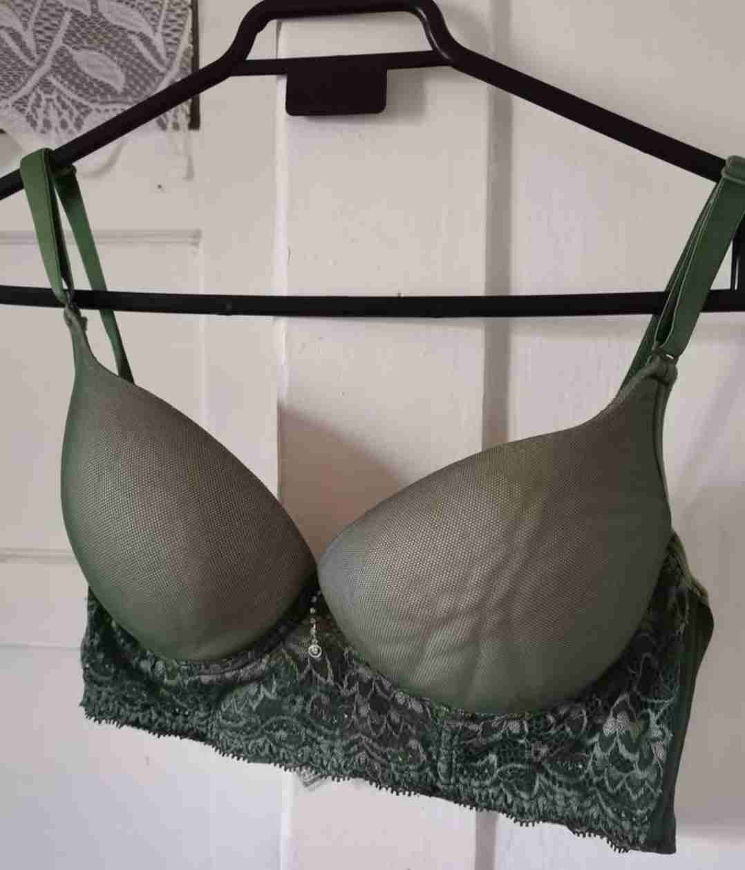 Sostén verde con detalles de encaje. Perfecto para un look elegante y cómodo. En buen estado. Talla: 38B