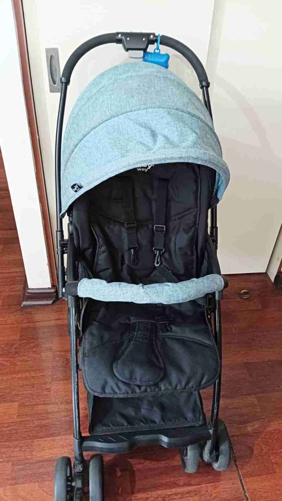 Coche de bebé negro y celeste