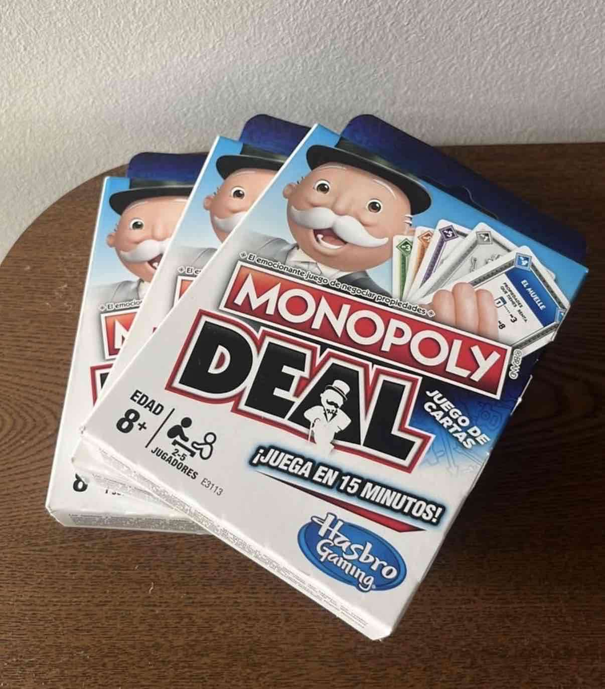 Monopoly Deal – Juego de Cartas Rápido y Divertido ¡Partidas de solo 15 minutos! Disfruta toda la emoción de Monopoly en una versión mucho más rápida y dinámica. Incluye 110 cartas: - Propiedades de distintos colores - Casas y hoteles (aumentan el valor) - Cartas de acción para cobrar alquiler y hacer intercambios estratégicos - Propiedades comodín (salvajes) - Cartas de dinero para pagar deudas Objetivo: Ser el primero en completar 3 conjuntos de propiedades diferentes. Ideal para jugar en familia, con amigos o llevar de viaje. Entretenido, fácil de aprender y muy competitivo!