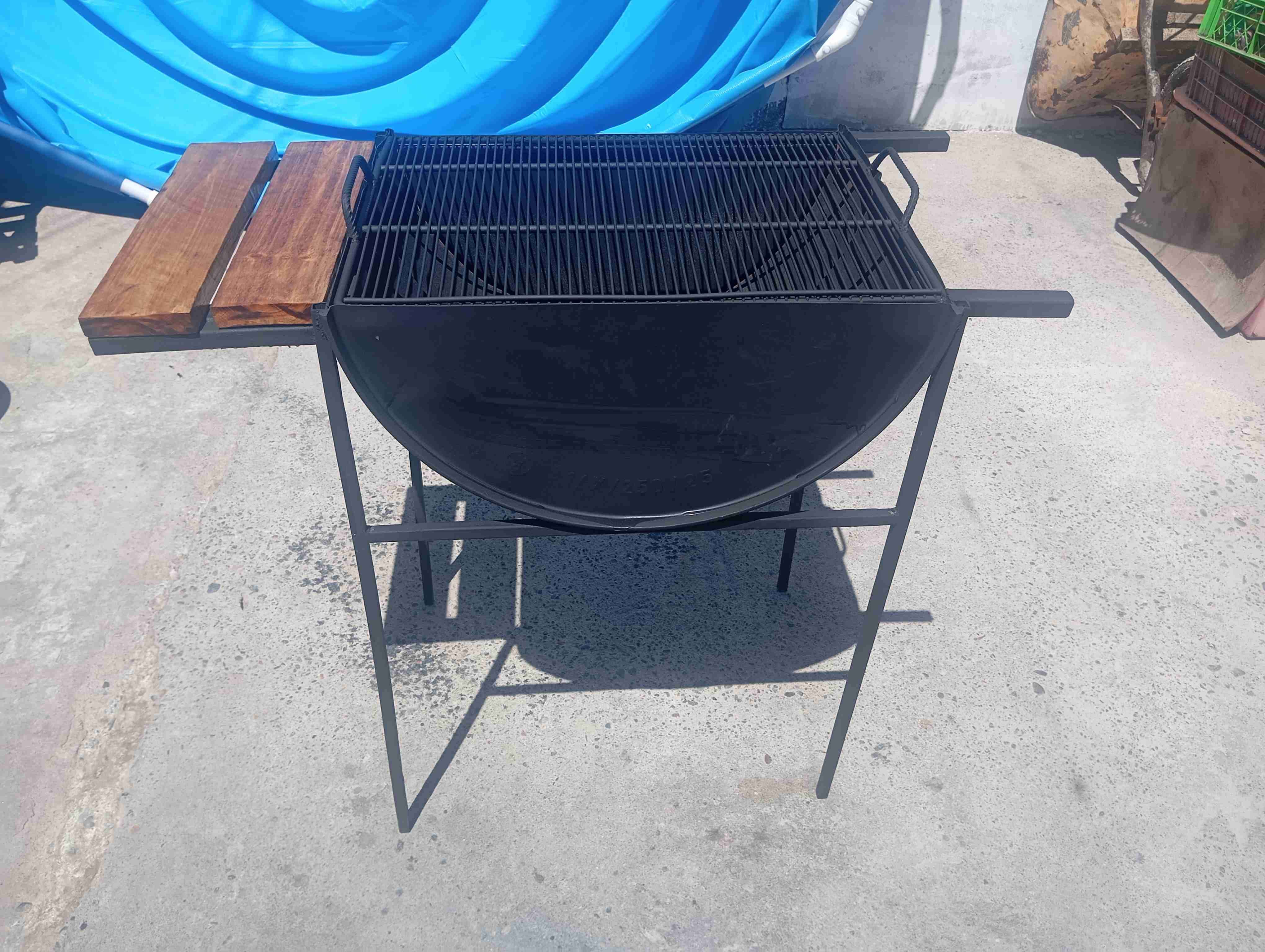 Parrilla de metal ideal para asados al aire libre. Incluye repisa de madera y gran espacio de cocción. Las pastillas son nuevas ay básicas y con niveles