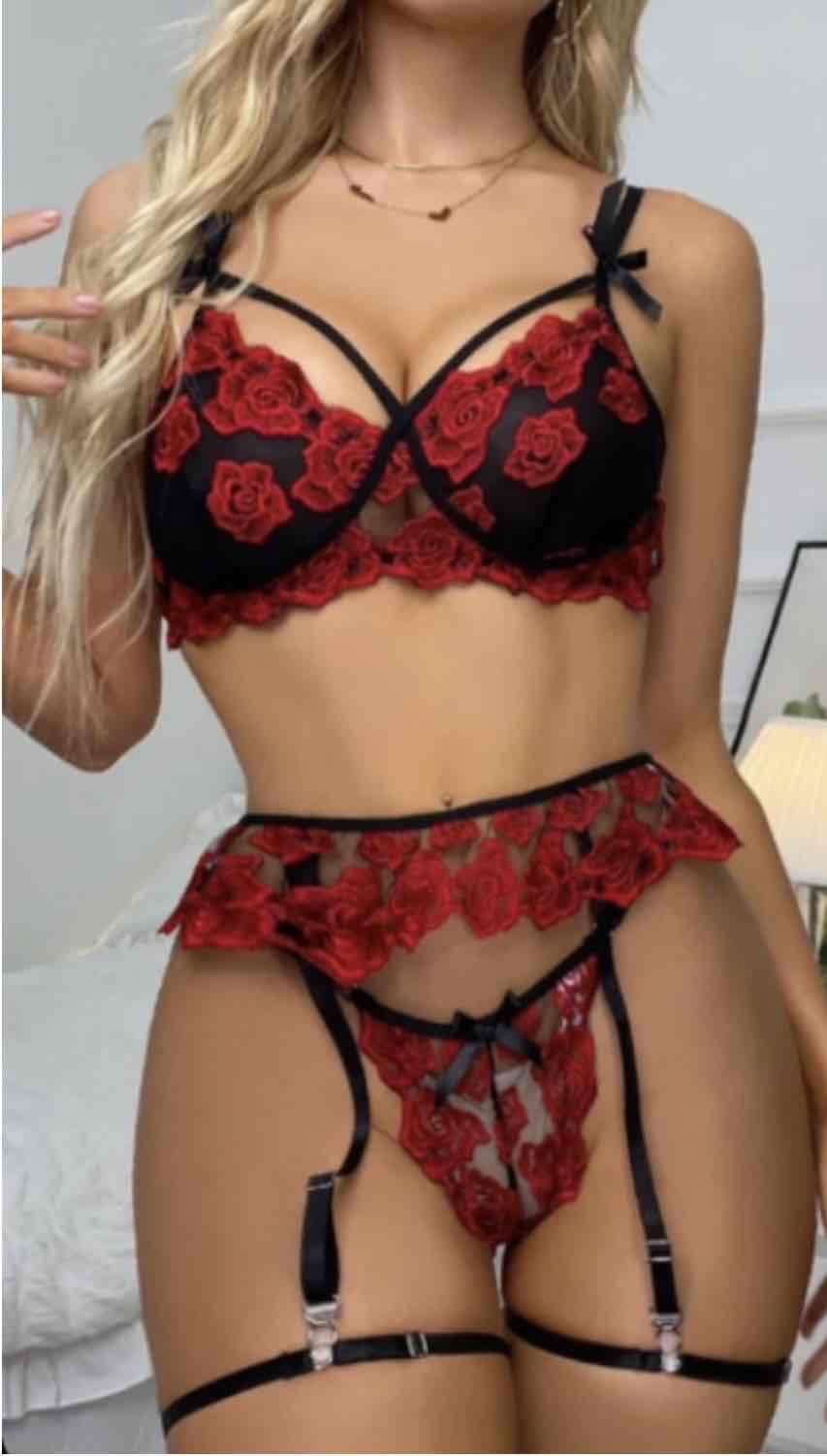 Conjunto de lencería con flores rojas bordadas. Ideal para ocasiones especiales. Estado nuevo.