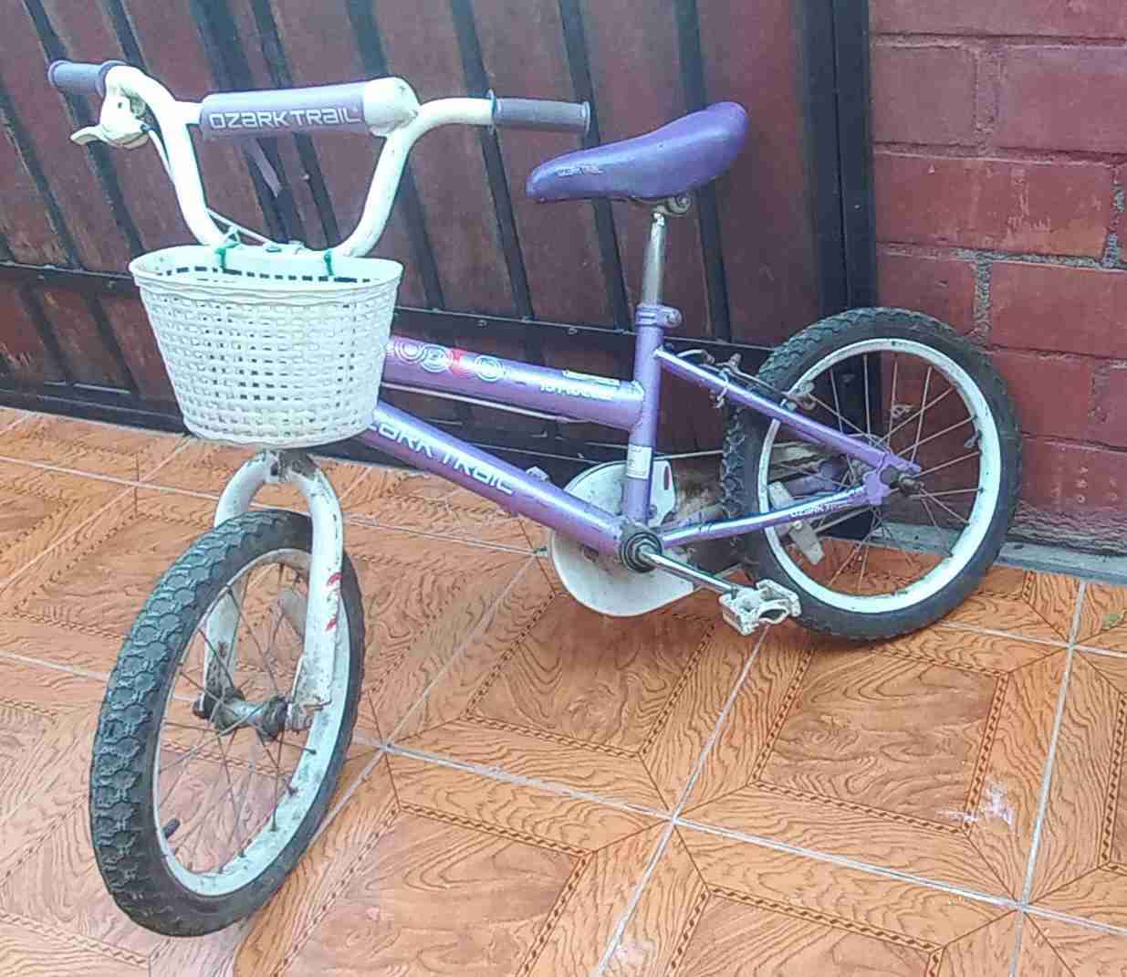 Bicicleta para niña, color morado con canasto frontal. En buen estado, ideal para paseos. Presenta signos de uso.