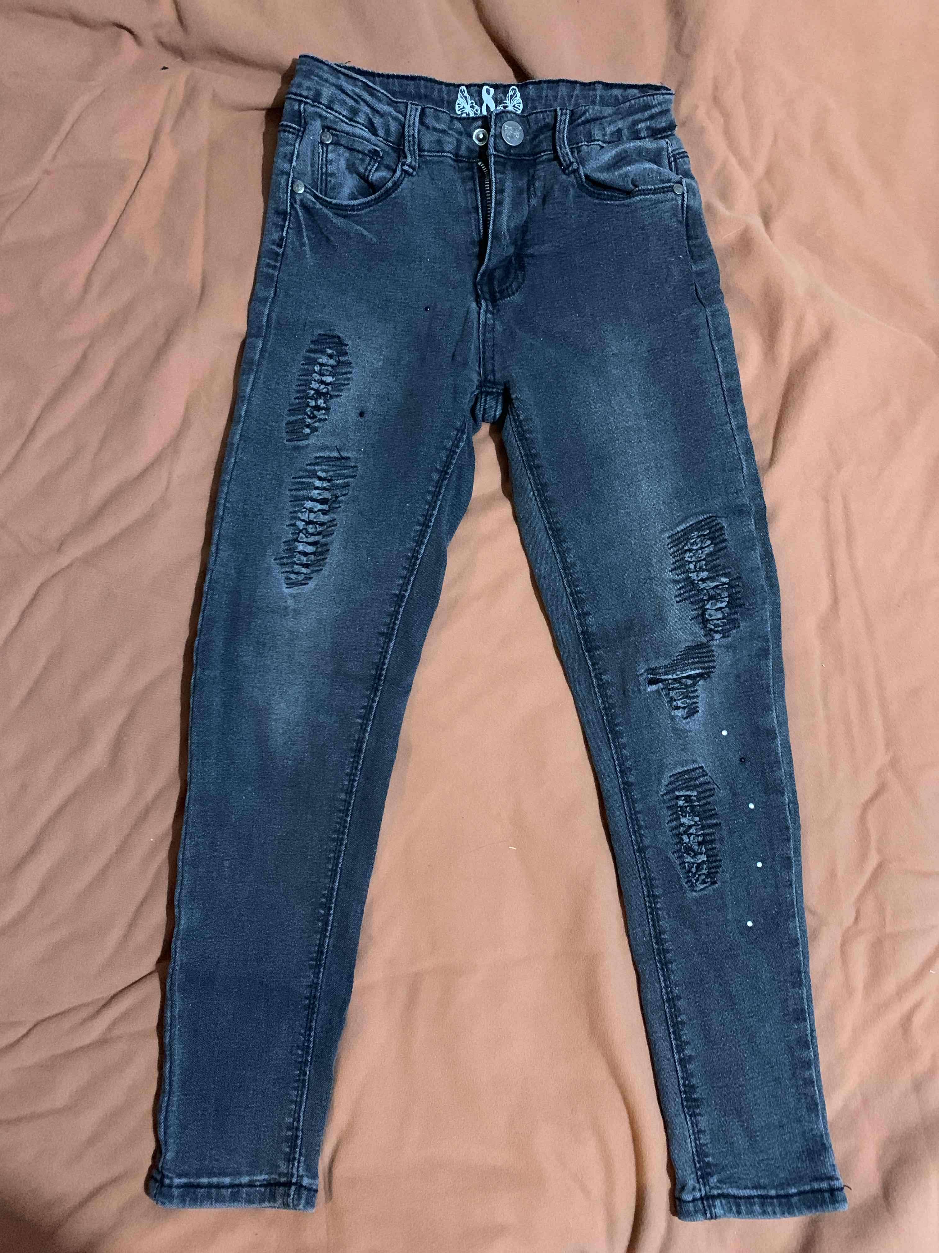 Jeans negro con diseño desgastado, en buen estado. Ideales para un look casual y moderno. Talla 8