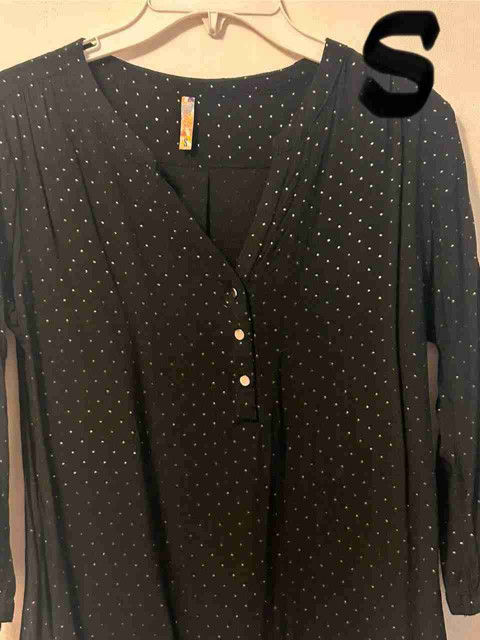 Elegante blusa negra con lunares pequeños, En buen estado, talla S. Tela delgada