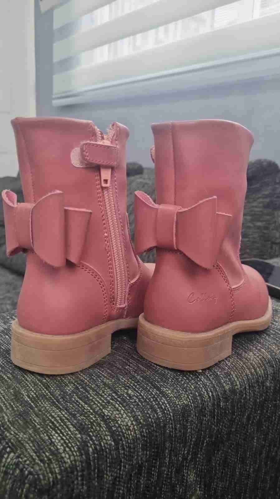 Botas de niña rosadas con lazo decorativo. Excelente estado, ideales para el invierno.talla 22