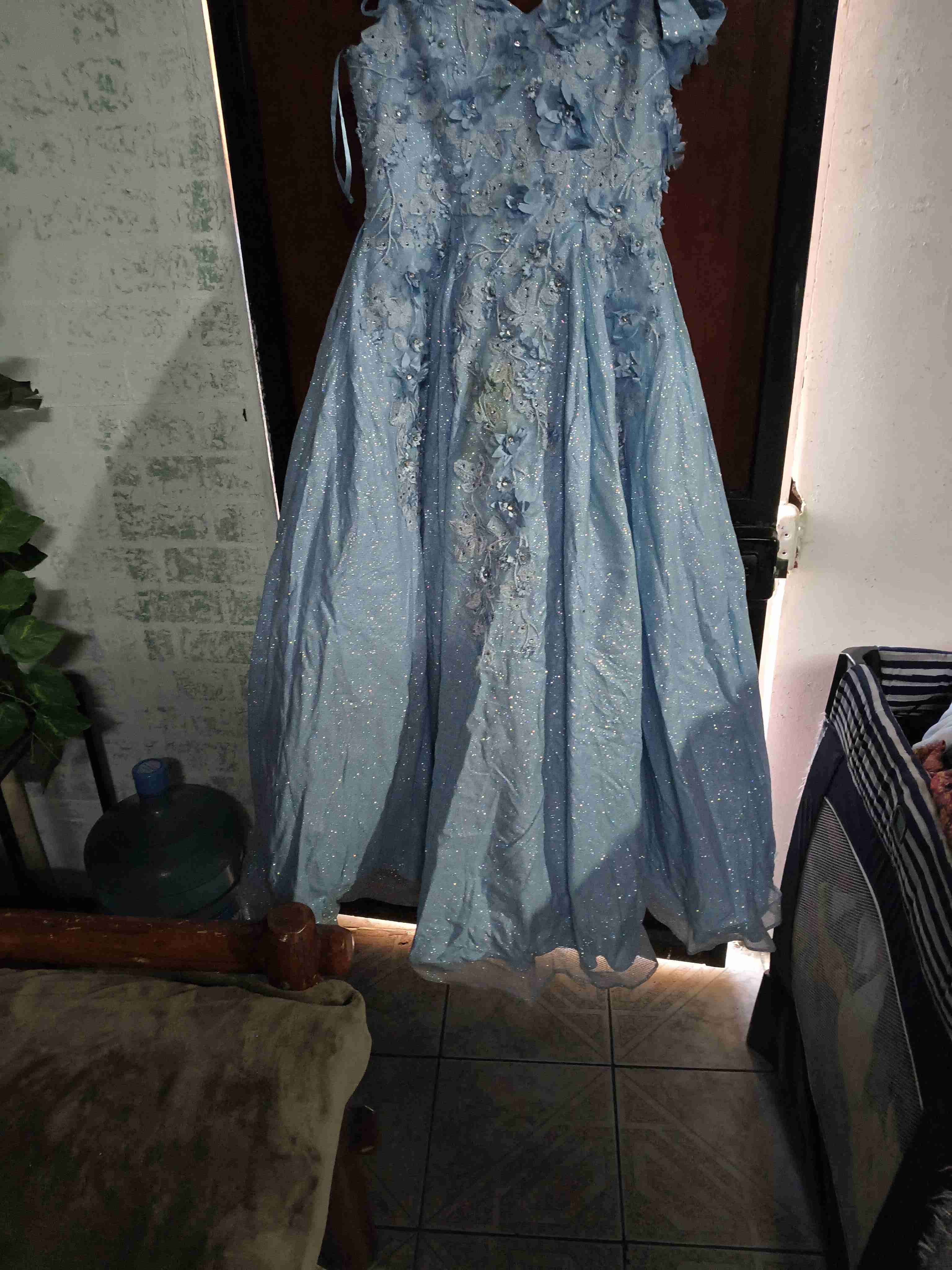 Elegante vestido de fiesta azul con detalles brillantes y aplicaciones florales. Perfecto para eventos formales.