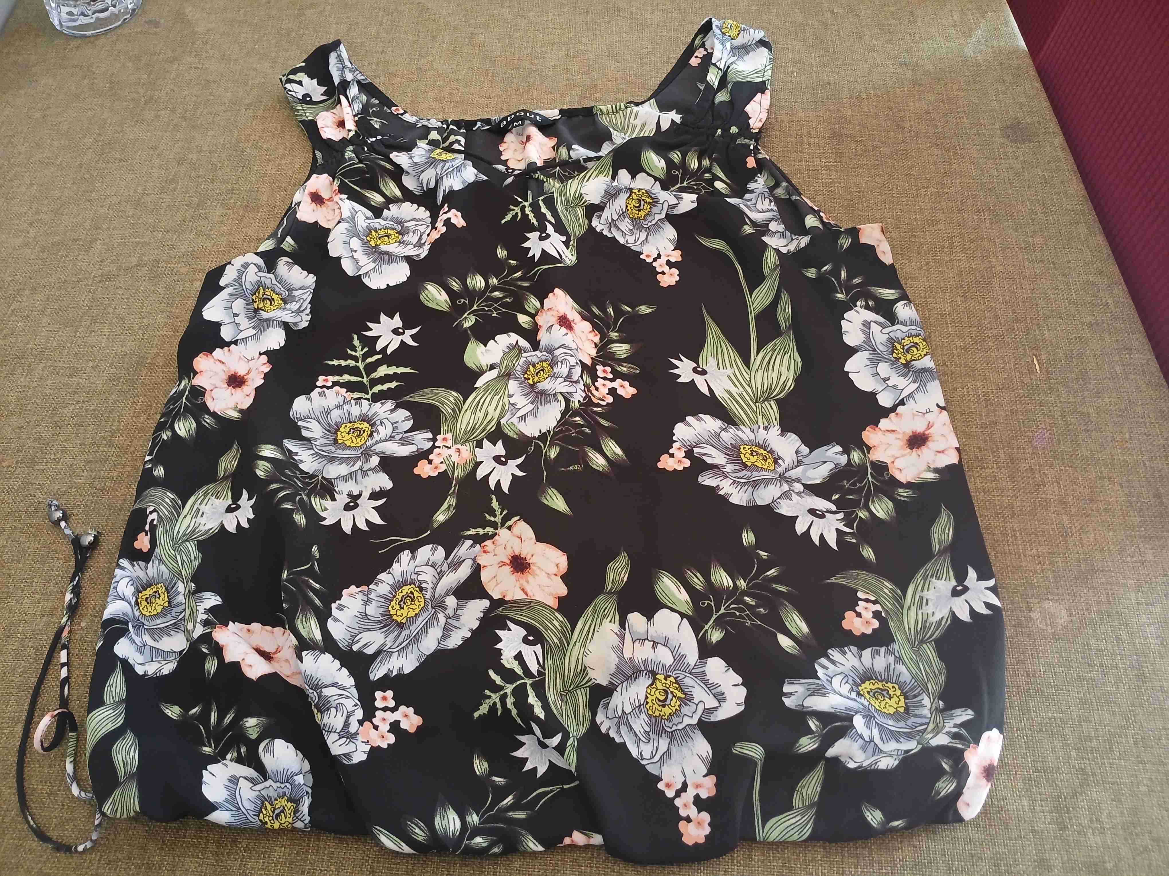 Blusa sin mangas con diseño floral en tonos oscuros. Ideal para un look casual o semiformal. En buen estado general.