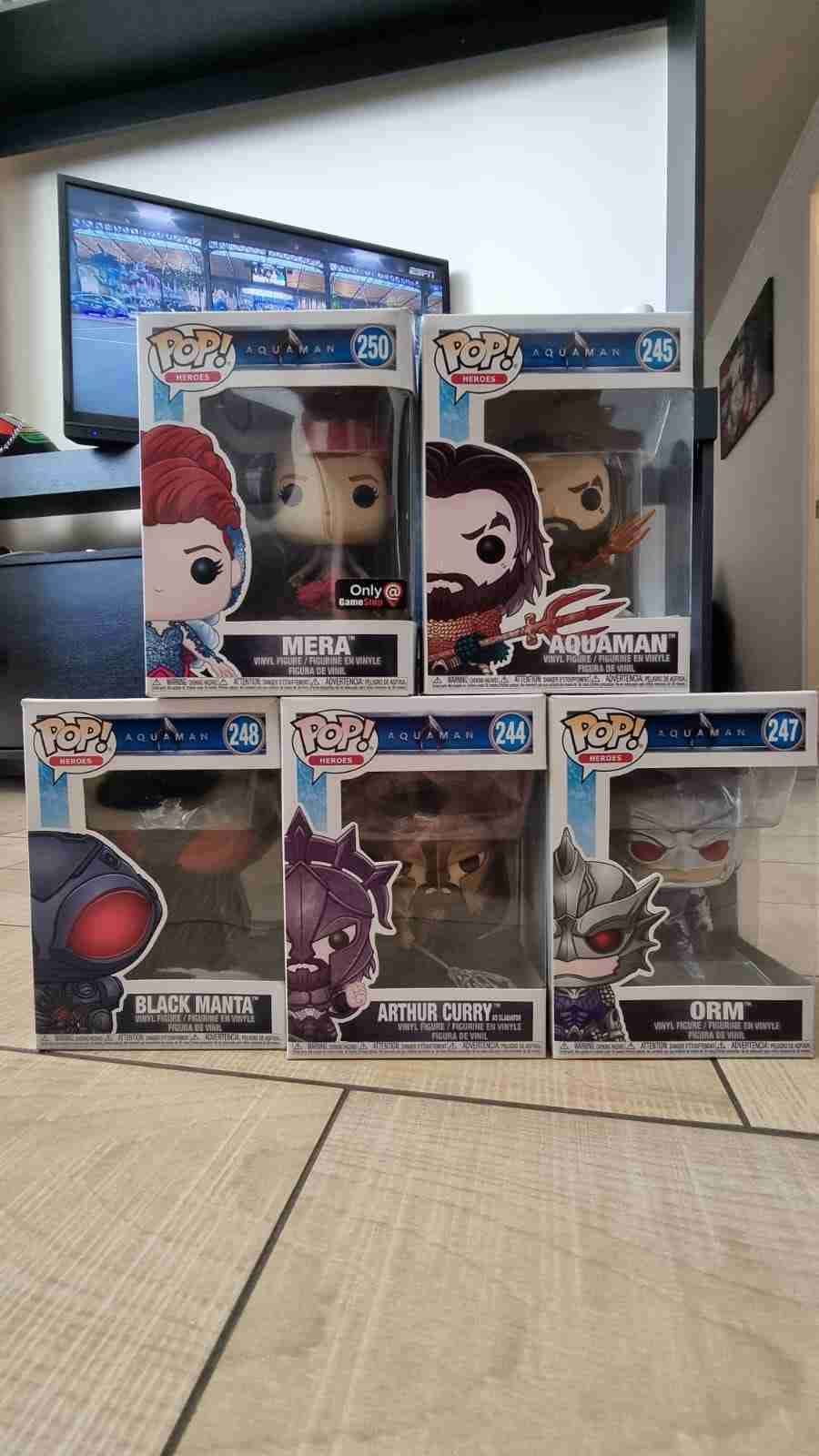 Set de figuras Funko Pop de Aquaman, en caja. Ideal para coleccionistas o fanáticos de DC Comics.