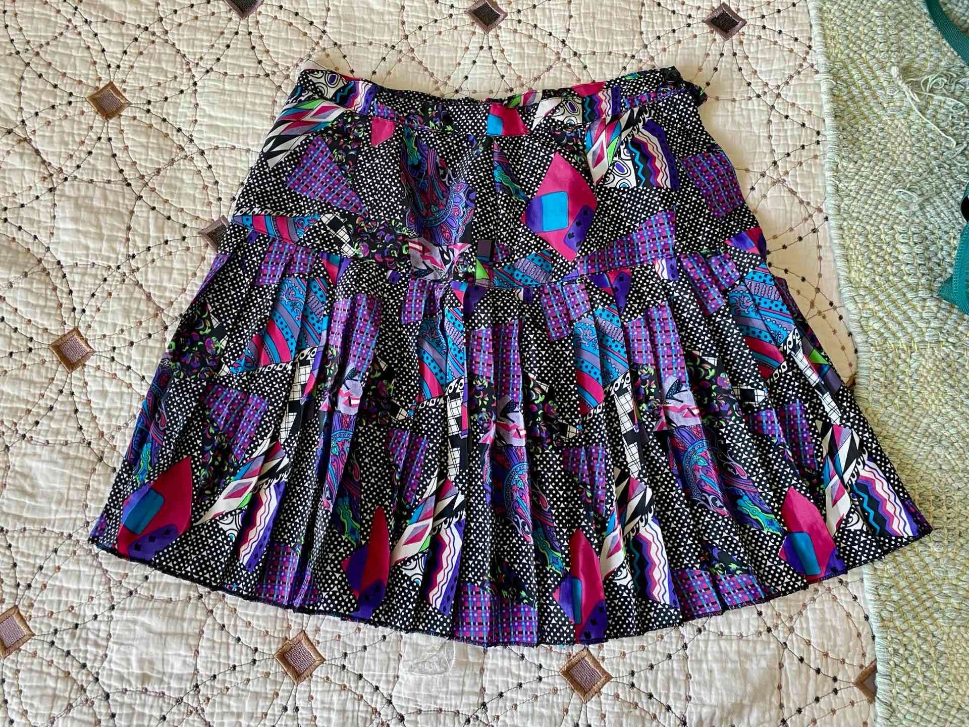 Falda vintage con diseño geométrico y colores vibrantes, perfecta para un estilo retro. En buen estado general.