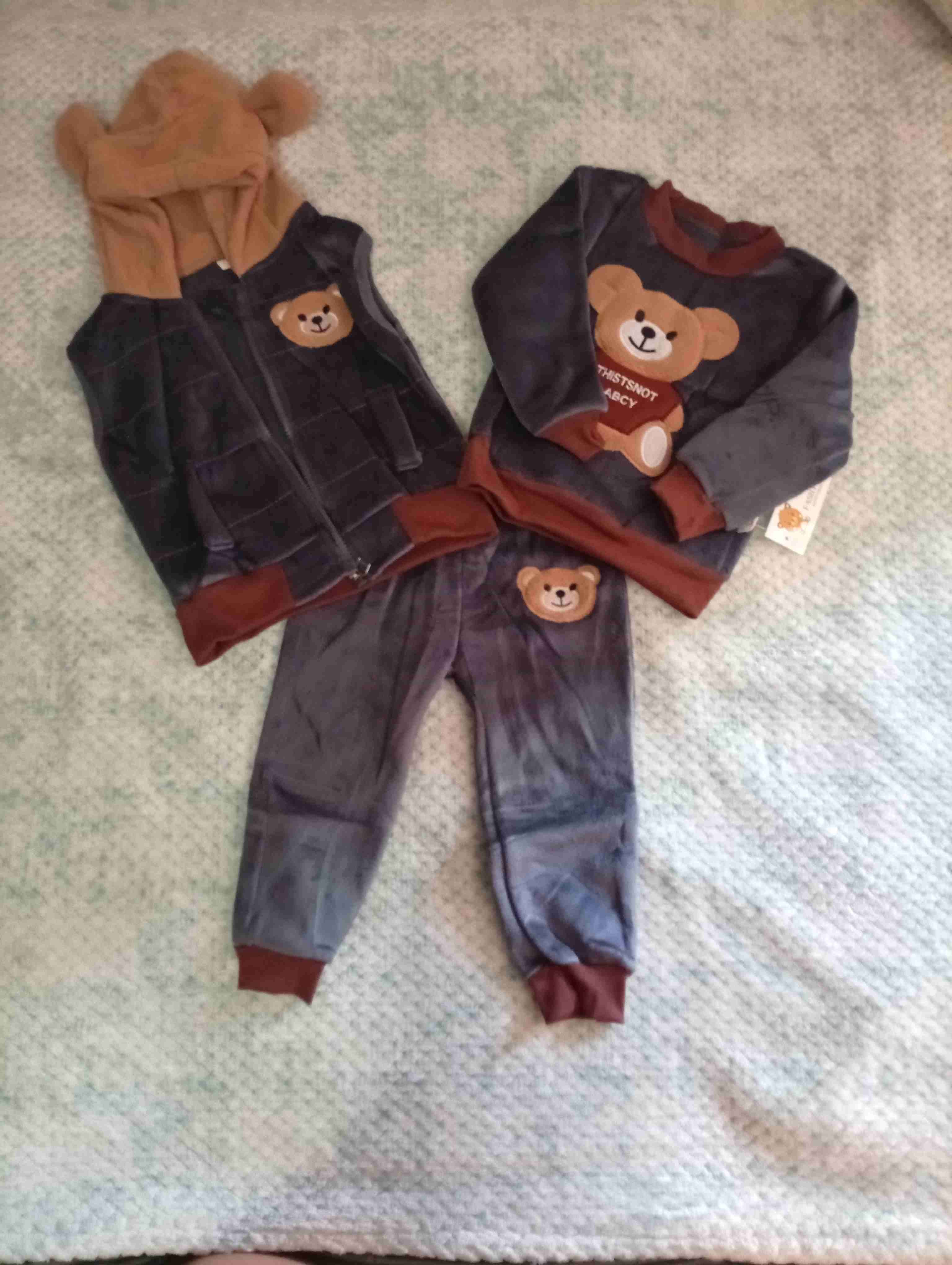 Conjunto de polar para niños con diseño de osito. Incluye chaleco, polerón y pantalón. Ideal para días fríos. Talla 3
