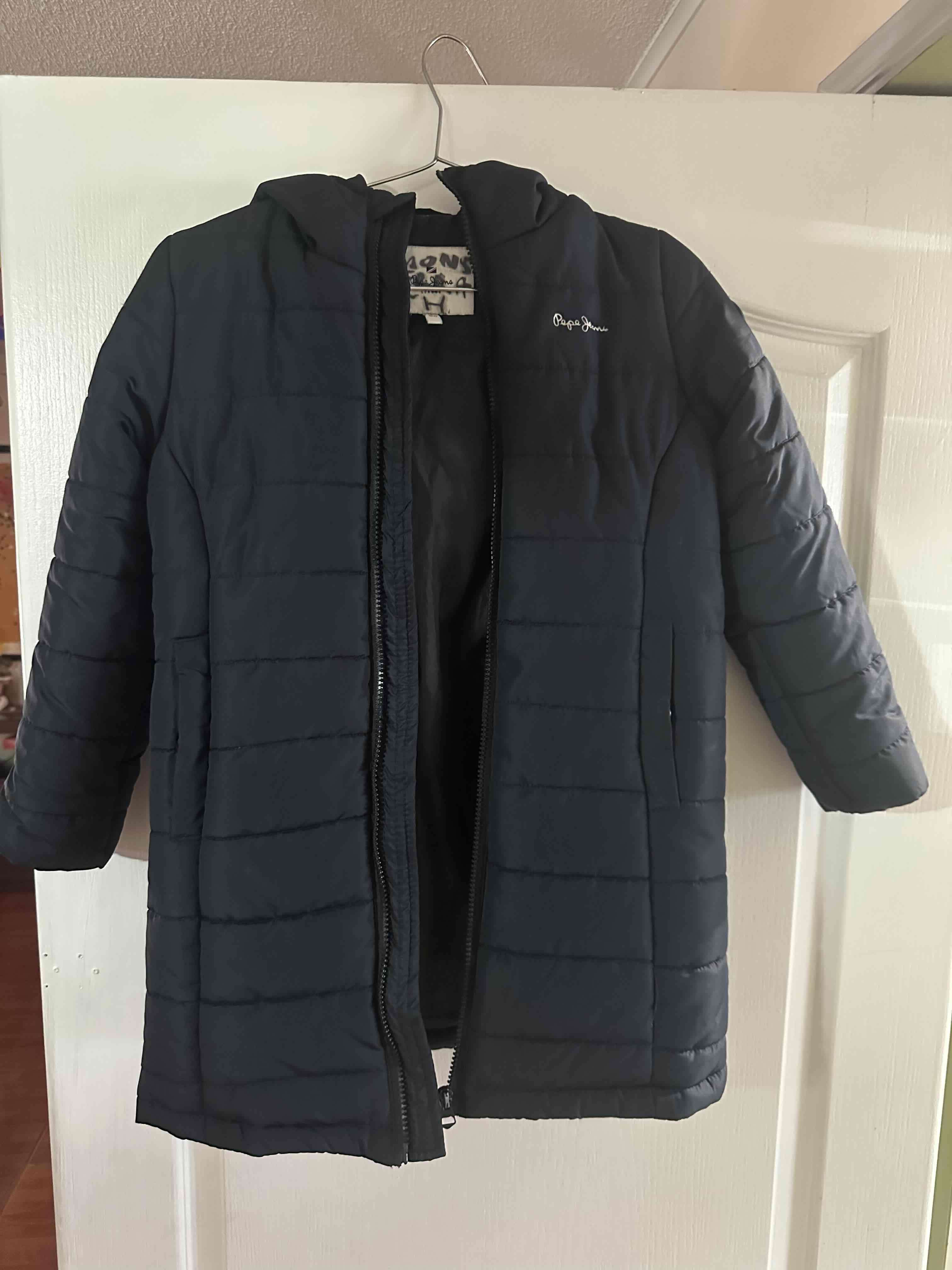 Abrigo largo negro con capucha, ideal para el invierno. Bien cuidado, sin marcas visibles.