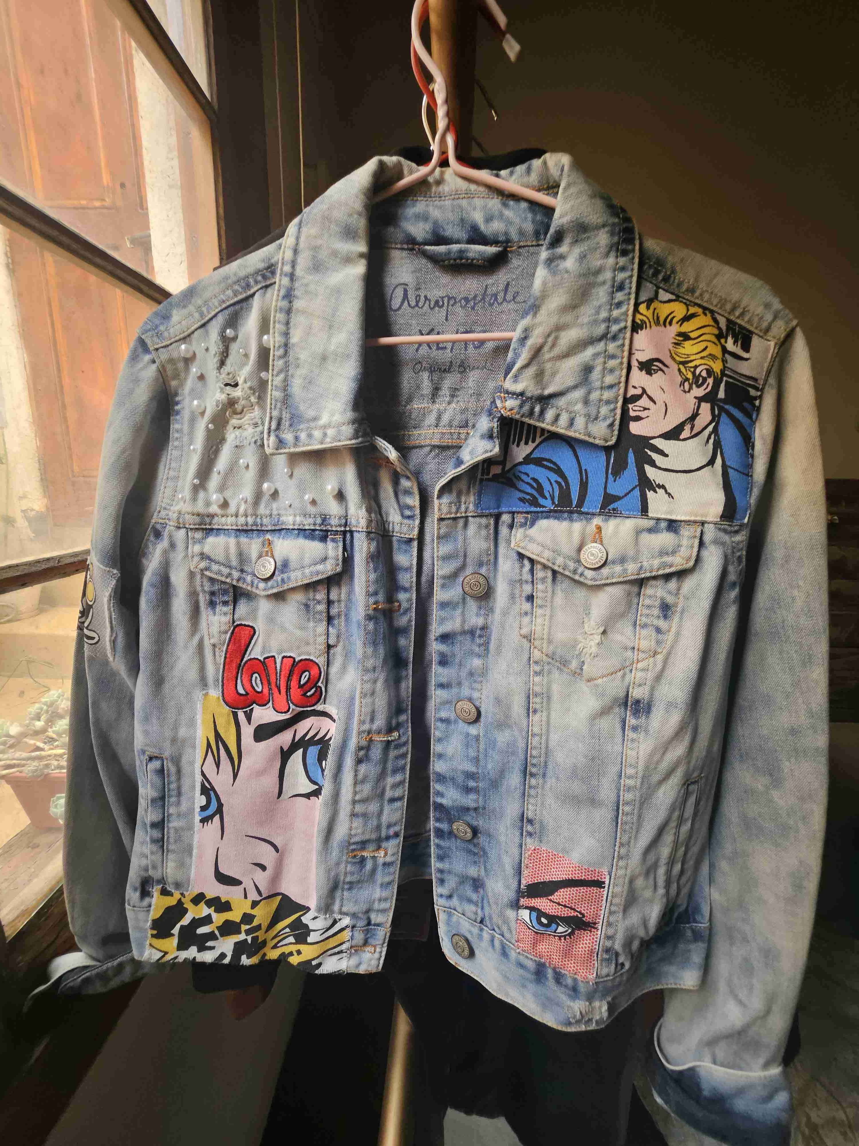Chaqueta de mezclilla única con divertidos estampados estilo pop art. Ideal para darle un toque diferente a tu look. En buen estado, con detalles visibles.