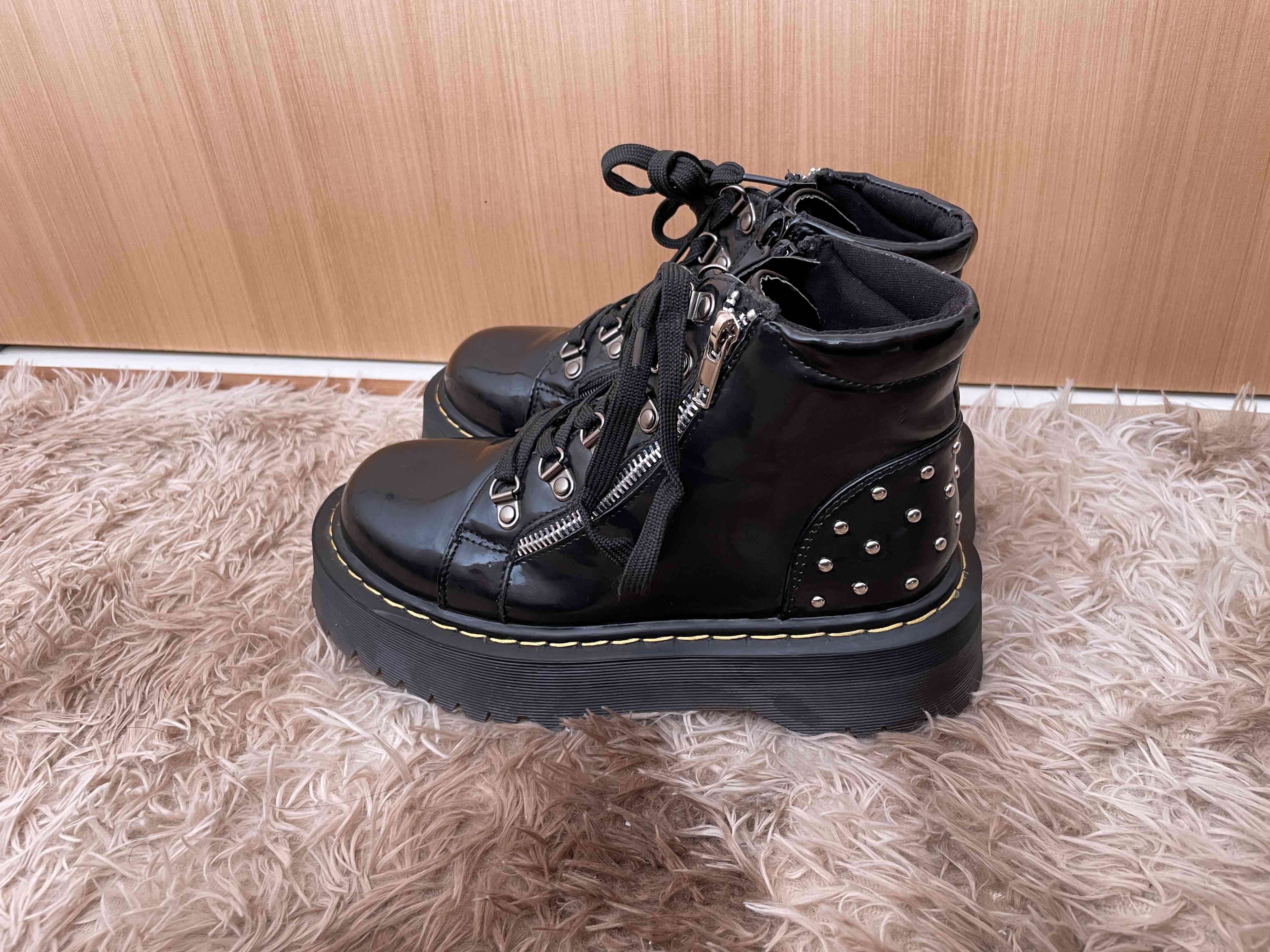 Botines de cuero sintético negros con plataforma alta y detalles de tachas plateadas. Perfectos para un look moderno y atrevido. En buen estado.